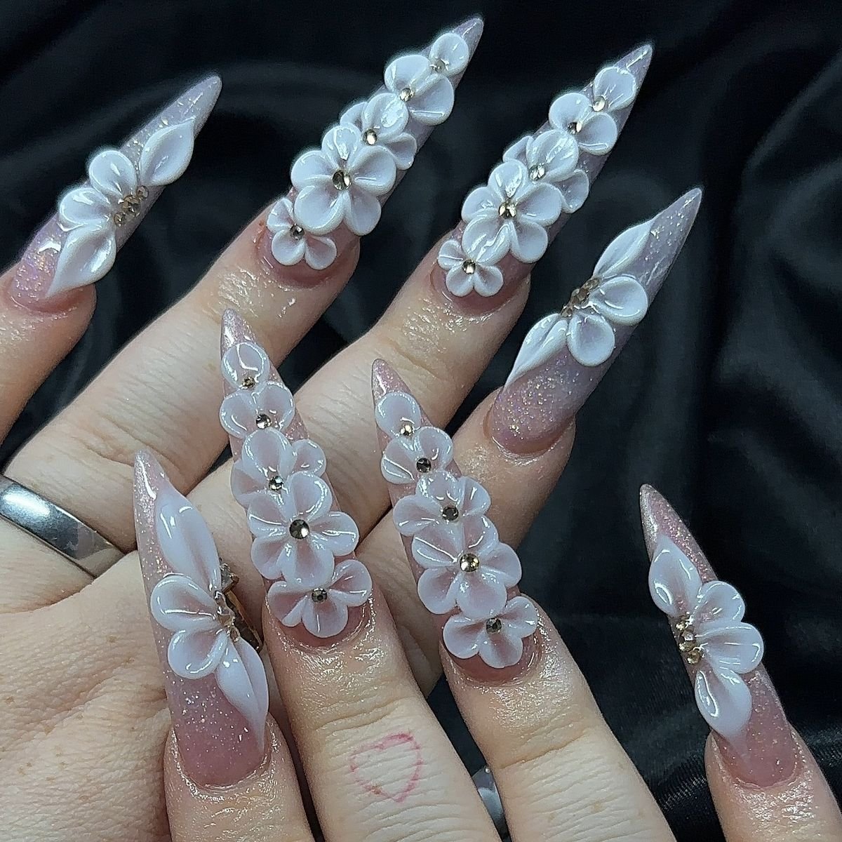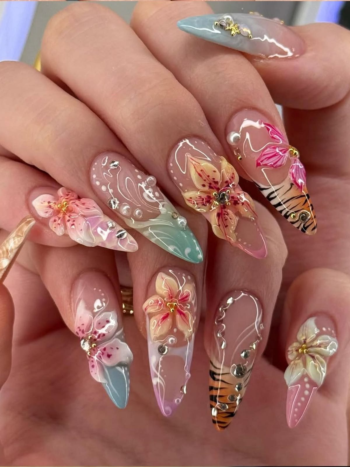Long pointed nails decorated with cascading flowers create a bold fashion statement that’s both glamorous and artistic.