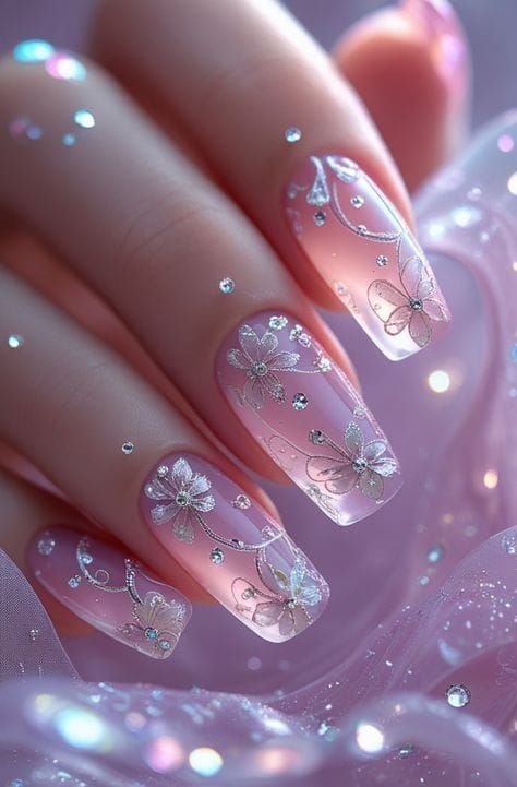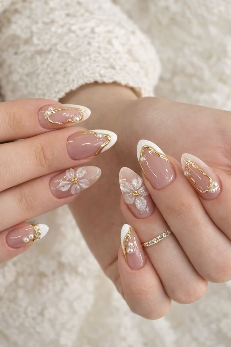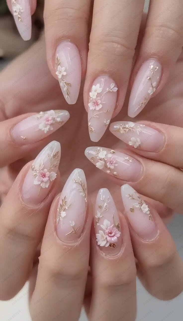 The nails usually have a sheer pink or milky white base, allowing the flowers to stand out beautifully. Small gold flakes or glitter accents mimic falling petals for a magical finish.