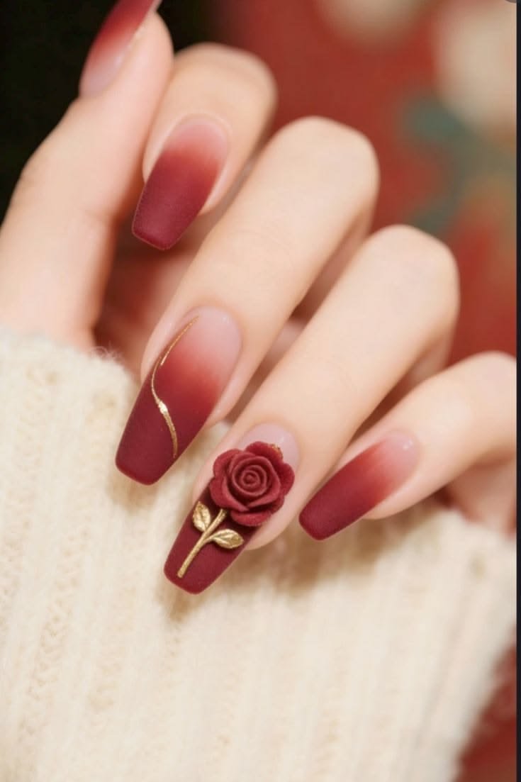 The timeless rose design remains one of the most requested 3D nail styles. Nail artists sculpt tiny roses using acrylic or gel, creating soft layered petals that look incredibly realistic.