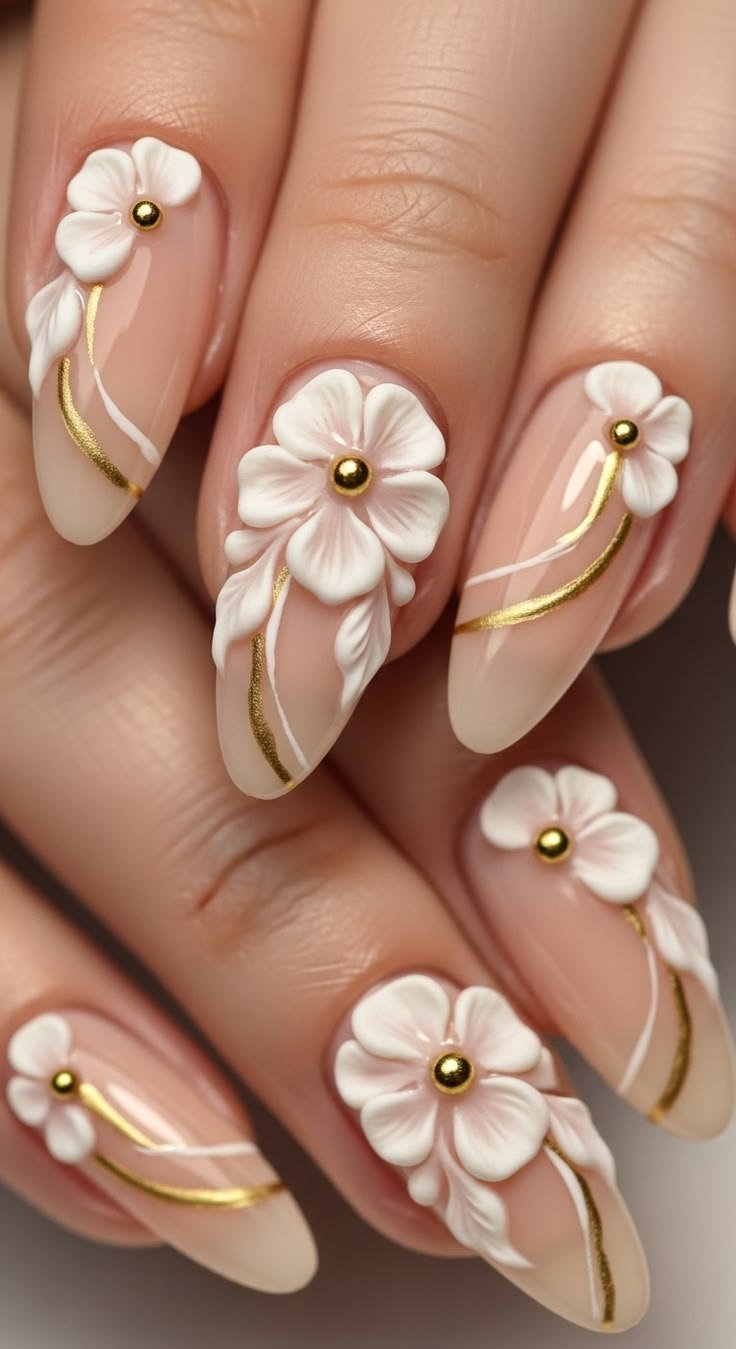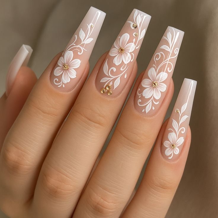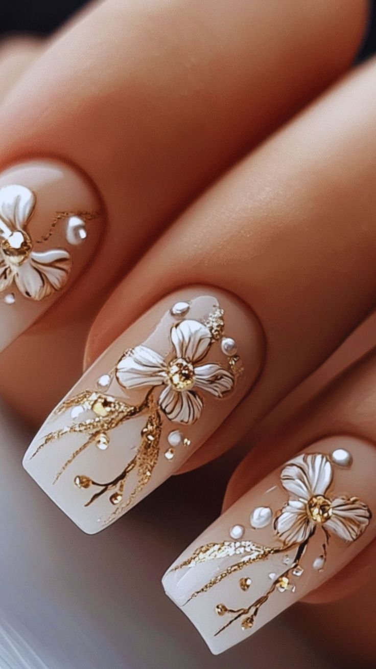 Bridal manicures often include white or ivory flowers sculpted delicately across the nails.