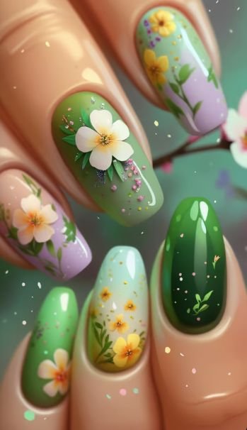 Why choose one flower when you can have many? Mixed floral nails combine roses, daisies, and other blossoms into one design.