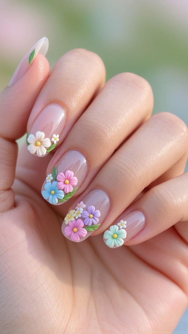 Pastel shades such as lavender, mint green, baby blue, and peach create a dreamy garden-inspired manicure. Small 3D flowers are placed across the nails like blooming petals in spring.