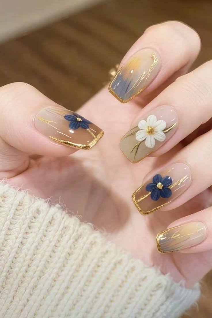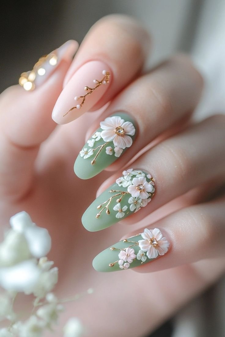 Delicate petals paired with gold leaf accents or metallic outlines give the nails a luxurious, high-fashion appearance.
