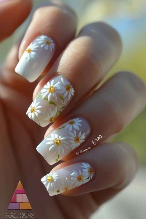 Daisies symbolize freshness and simplicity. These tiny white flowers with yellow centers look adorable on short or medium nails.