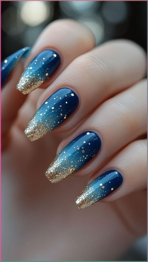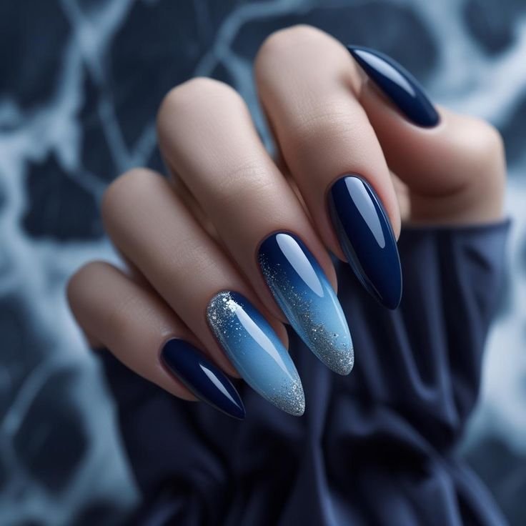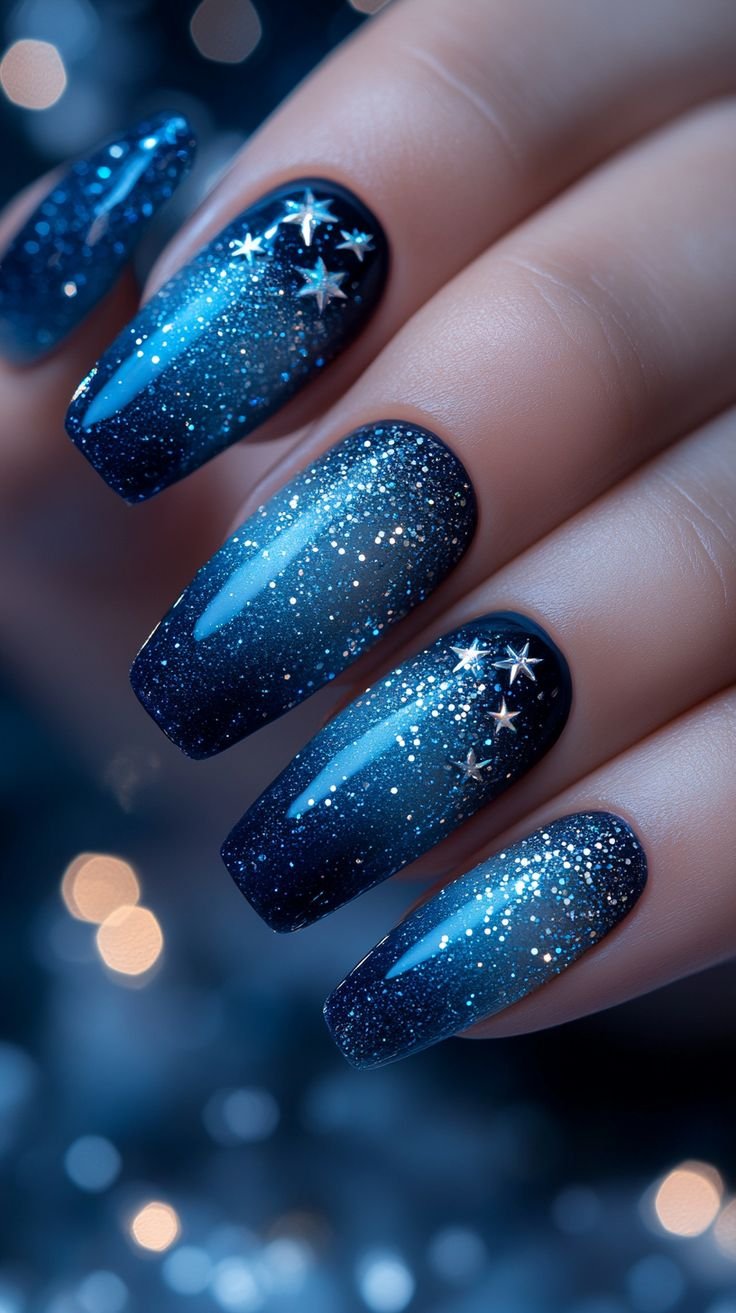 The foundation of this look is a rich sapphire blue base, which can range from deep navy-leaning tones to brighter jewel-like shades. On top of this base, glitter is added in varying intensities—fine shimmer for a subtle glow or chunky glitter for a more dramatic effect. Silver glitter is the most popular choice, as it enhances the cool tones of blue, but hints of holographic or gold sparkle can create a more unique and playful finish.