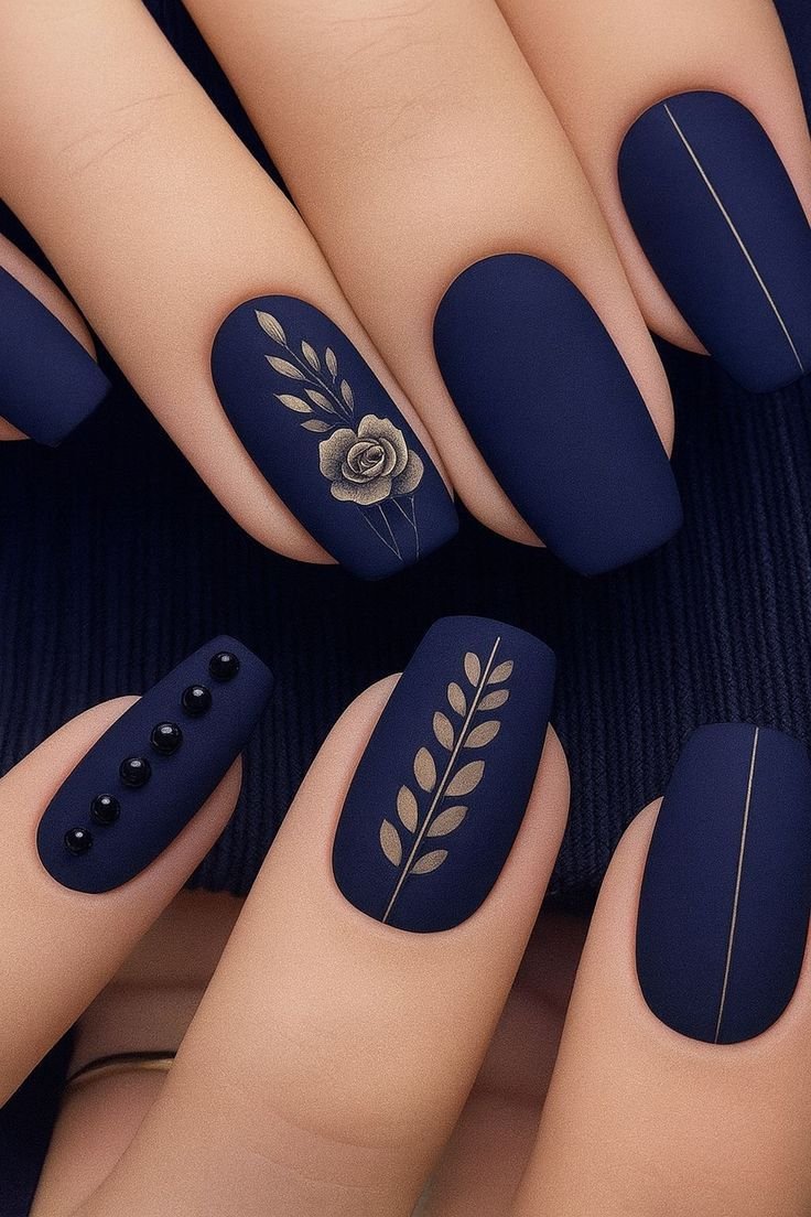 Whether worn alone or with accent designs, matte navy nails provide a clean and polished look that fits seamlessly into autumn fashion trends.
