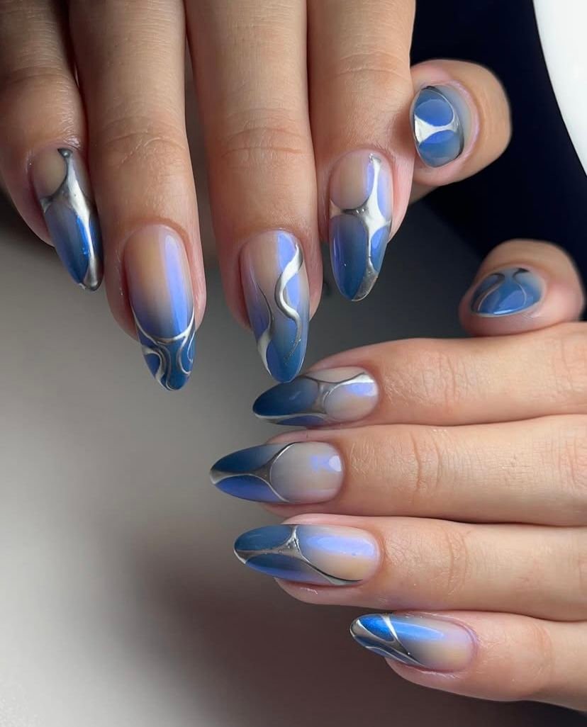 One of the most appealing aspects of this style is its versatility. You can choose a deep navy or cobalt base and add silver foil, glitter, or chrome details for a striking contrast. For a softer look, lighter blue shades paired with fine silver lines or delicate shimmer create an airy, elegant design. Ombre effects are also popular, gradually blending blue into silver for a smooth, eye-catching transition that mimics icy skies or frosted landscapes.