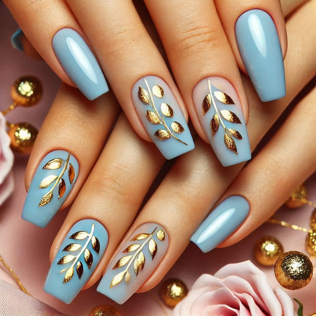 Soft sky blue nails bring a refreshing twist to traditional autumn colors. In 2026, pairing this light shade with delicate leaf designs is a major trend. Think hand-painted autumn leaves in shades of orange, brown, and gold layered over a pastel blue base.