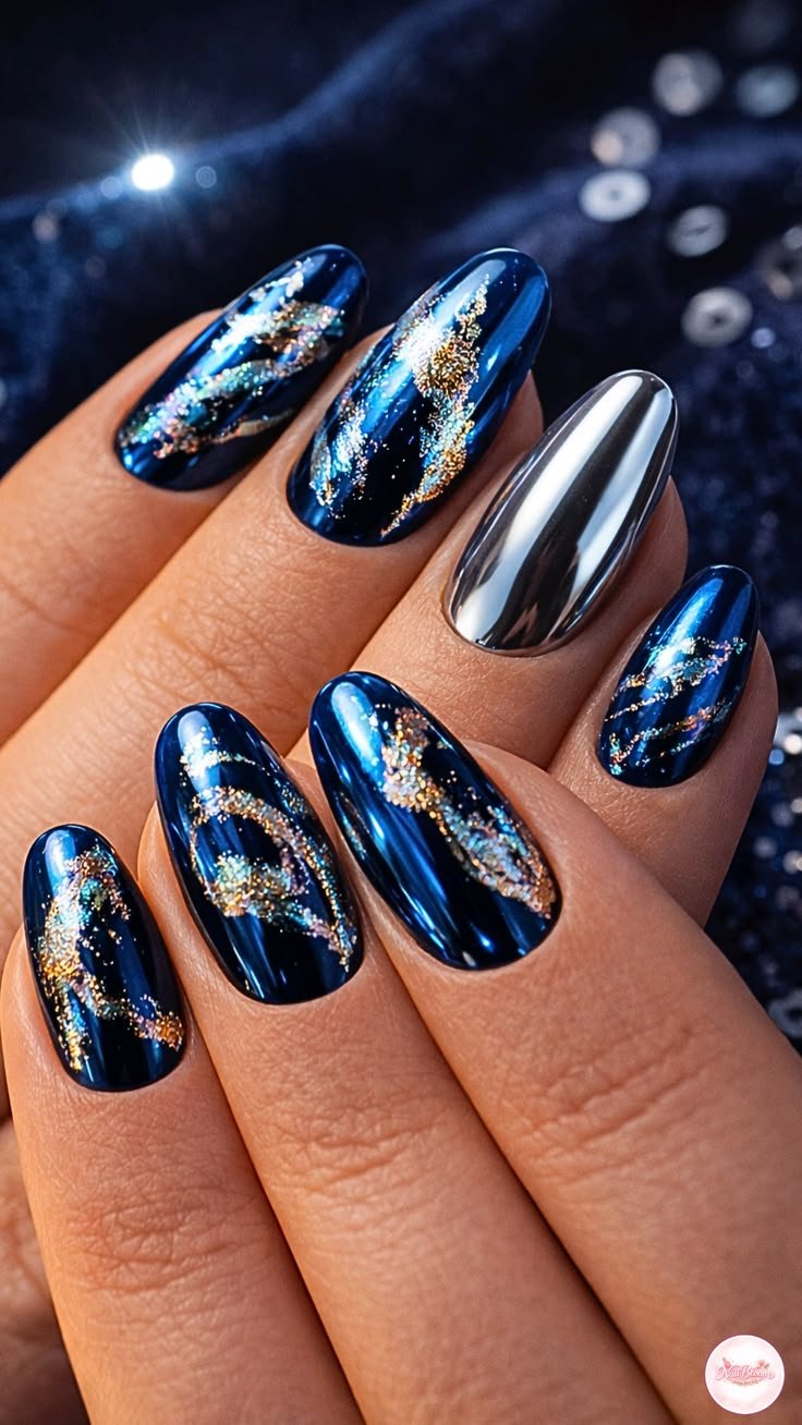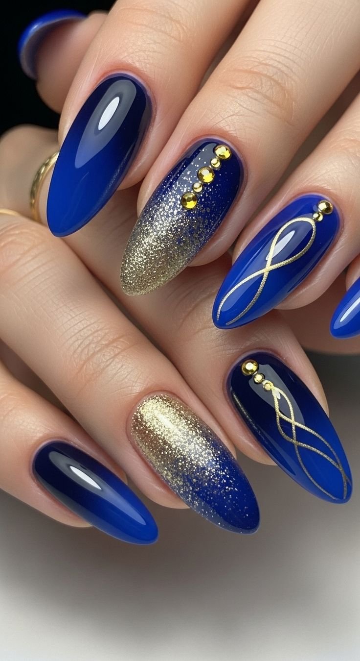 The beauty of this style lies in its contrast. The deep intensity of royal blue enhances the brightness of gold, making every detail stand out. You can keep the design simple with gold foil flakes scattered across a glossy blue base, or go more intricate with gold lines, geometric patterns, or delicate metallic tips. Some variations even include gold chrome accents or embossed designs for a more dramatic, high-end finish. Whether subtle or bold, the combination always feels polished and intentional.