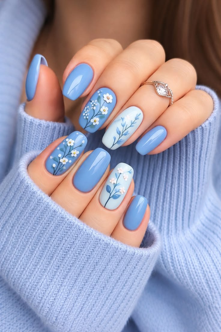 One of the standout features of blue floral nails is their versatility. You can choose intricate hand-painted flowers for a detailed, artistic finish or opt for minimalist floral accents on a neutral or sheer base. Accent nails work especially well, allowing one or two nails to showcase floral art while the rest remain a solid blue shade. Adding subtle touches like gold foil, tiny rhinestones, or soft glitter can elevate the design without overpowering its delicate nature.