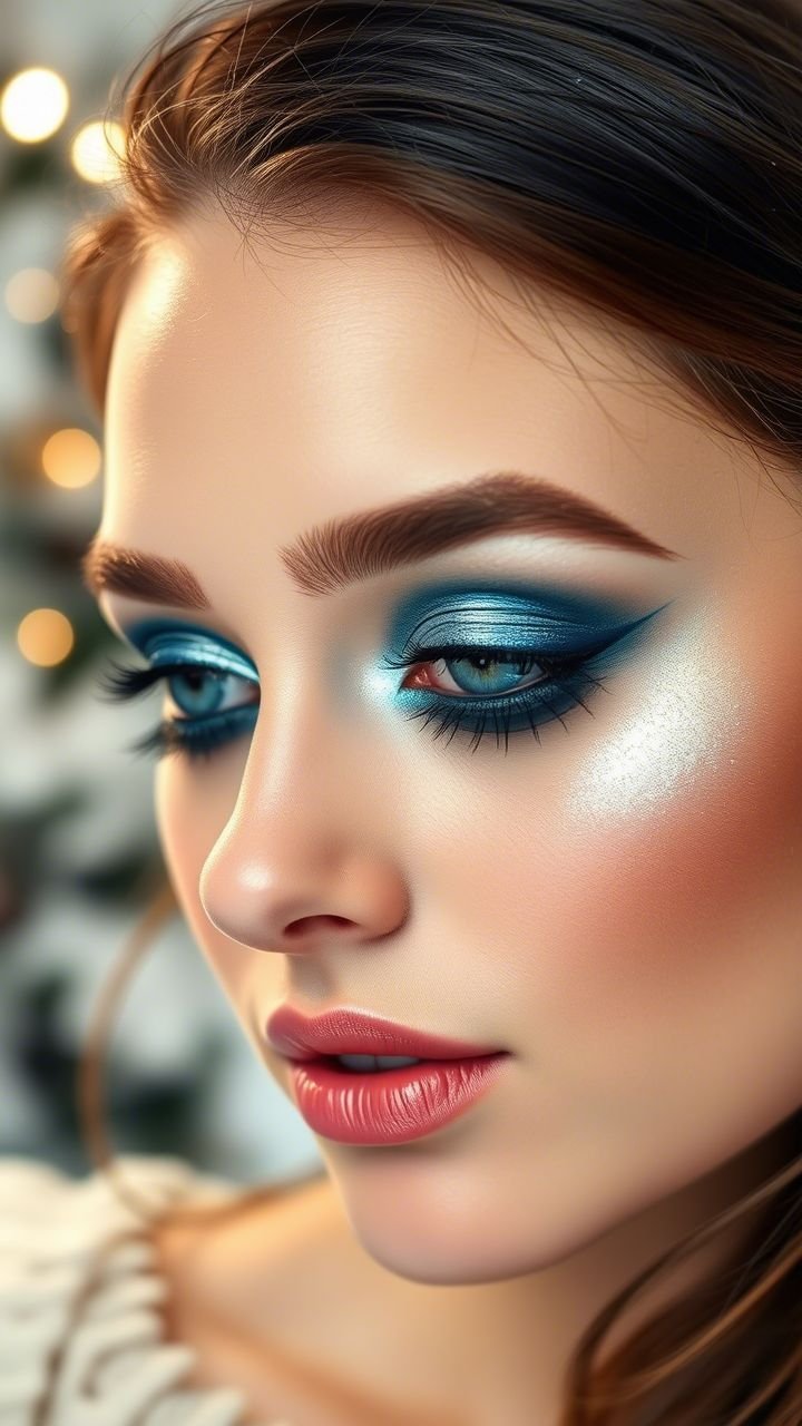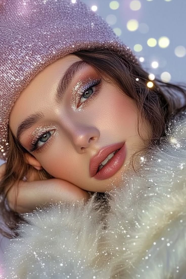 Inspired by icy winter landscapes, this look embraces cool tones and shimmering textures. Use a pale, luminous foundation with silver-toned highlighter for a frosted effect. Eyes should feature icy blue, silver, or white shimmer shadows, blended softly for a dreamy finish. Add a touch of glitter to the inner corners to brighten the eyes. Finish with pale pink or frosted gloss lips. This look is perfect for those who want to channel a magical winter aesthetic while staying festive and unique.