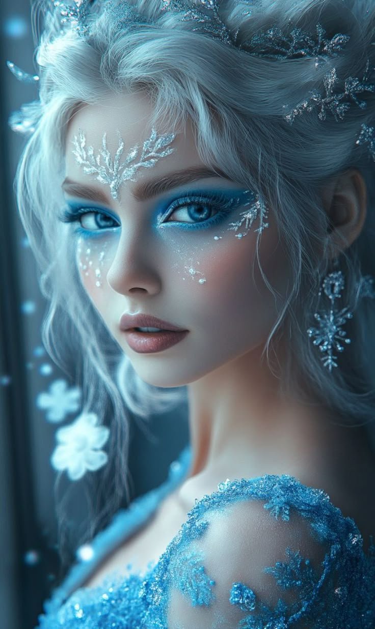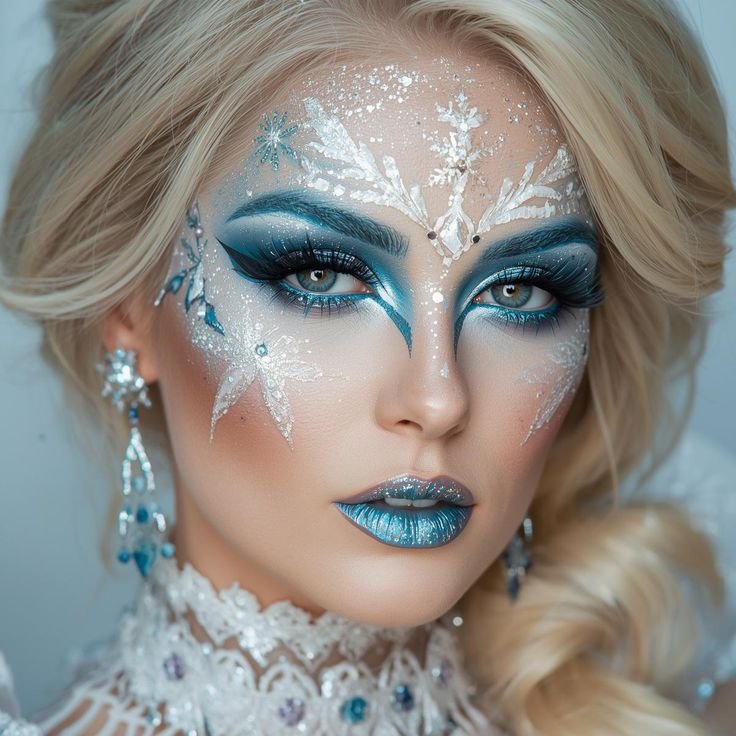 To begin, create a flawless, luminous base using a dewy foundation and a subtle highlighter to mimic a frosty glow. Soft, cool-toned makeup works best for this look—think icy blues, silvers, and pale purples blended gently across the eyes. Once your base makeup is complete, it’s time for the main feature: the snowflakes.