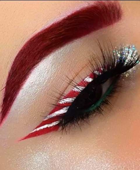 Get playful with a candy cane-inspired eyeliner design. Use red and white liner stripes along your wing for a fun holiday twist. Keep the rest of your makeup simple with soft blush and gloss. This creative look is great for parties and social media photos.