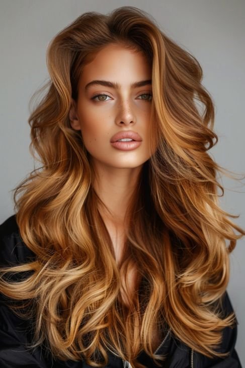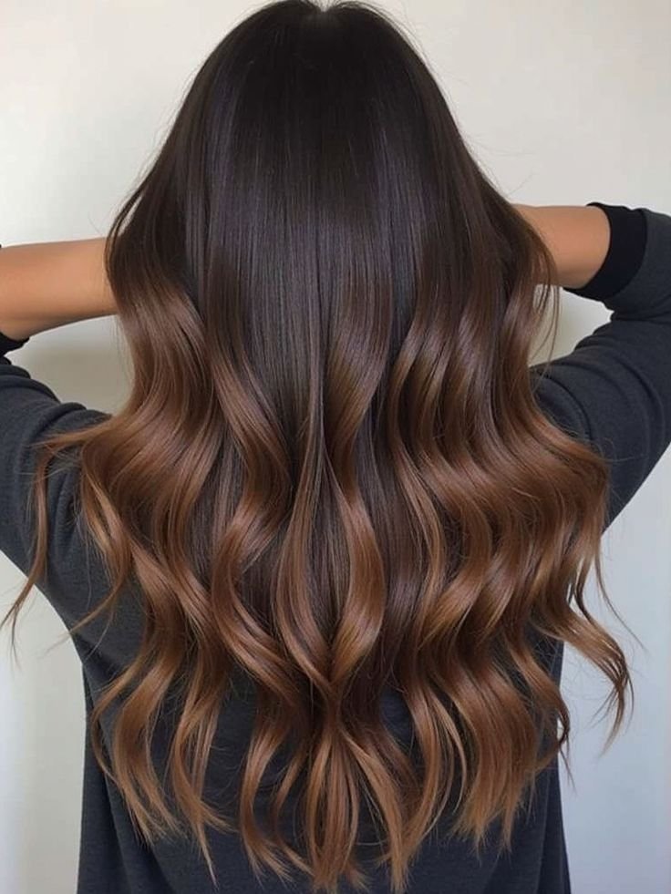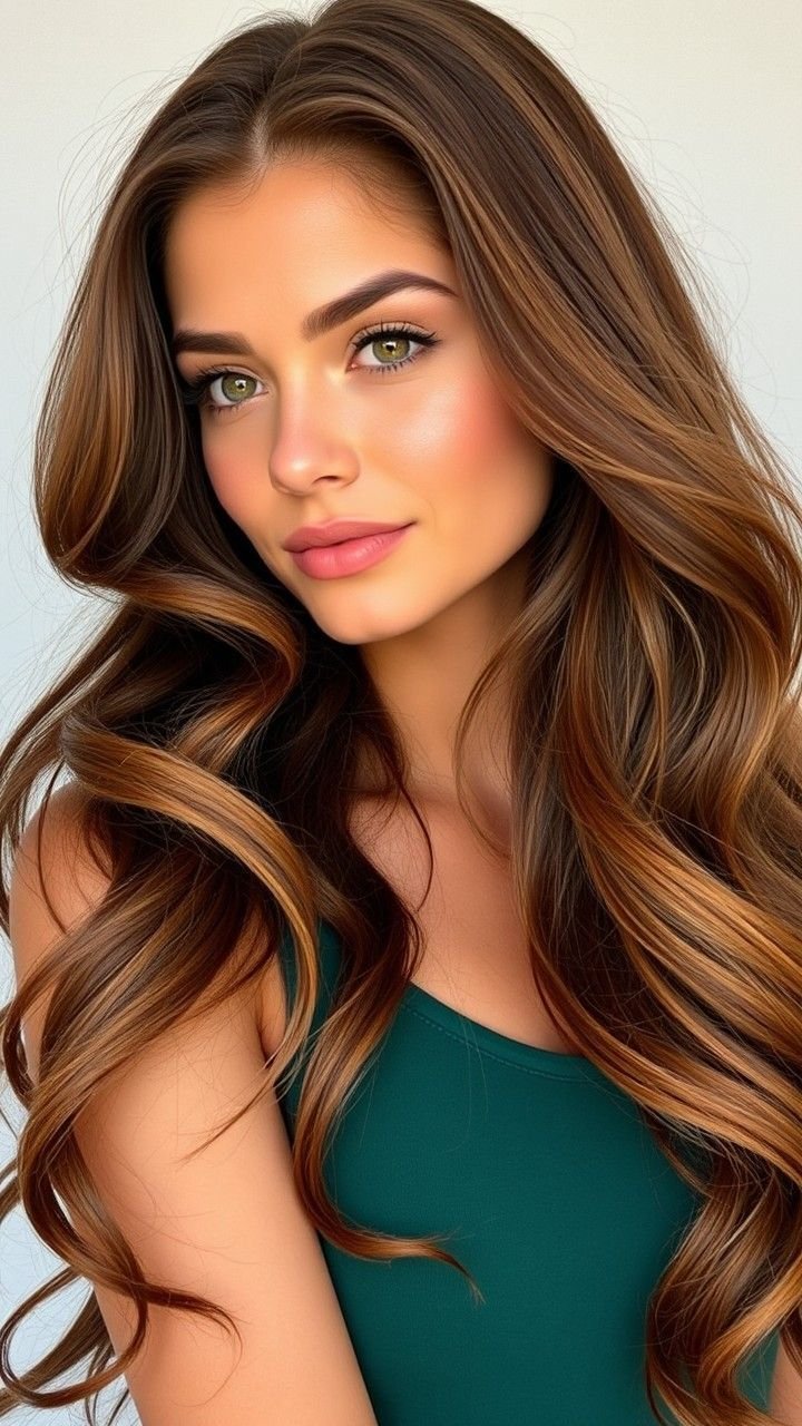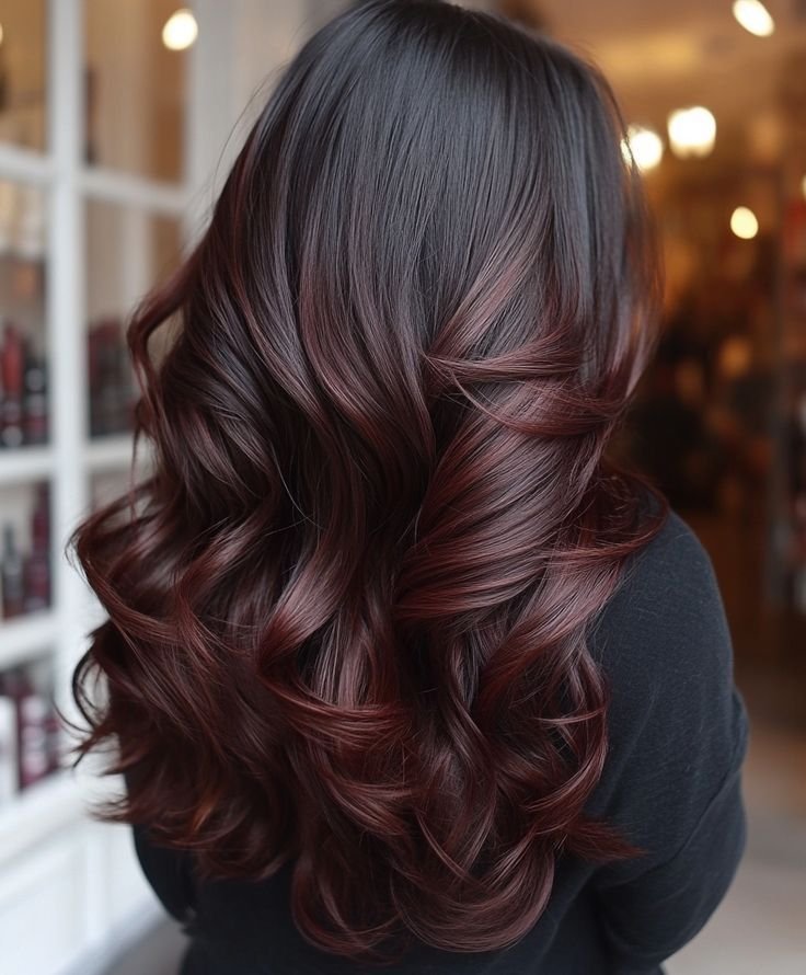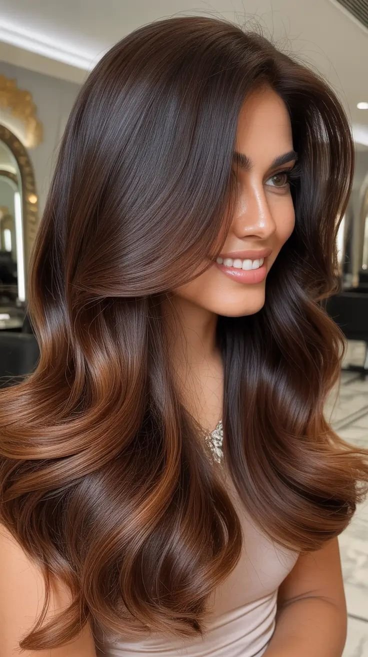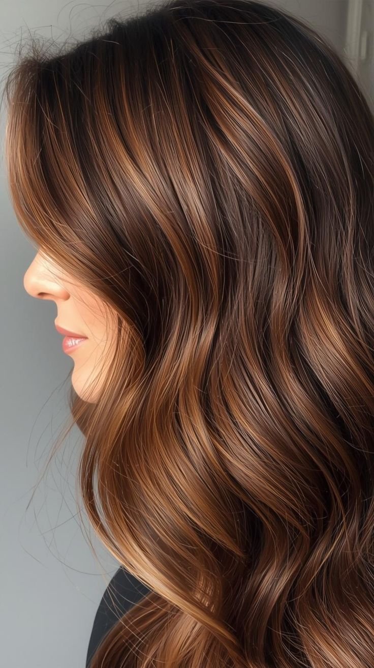 Auburn tones mixed with brunette create a vibrant, warm look. It’s perfect for fall and adds a touch of boldness while staying natural.