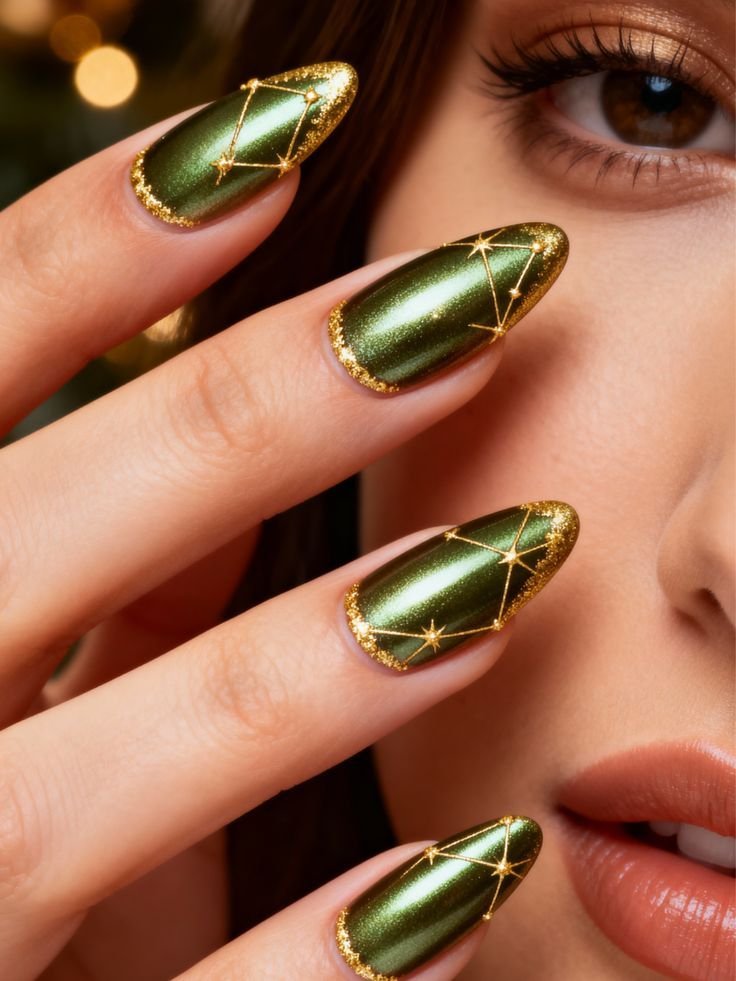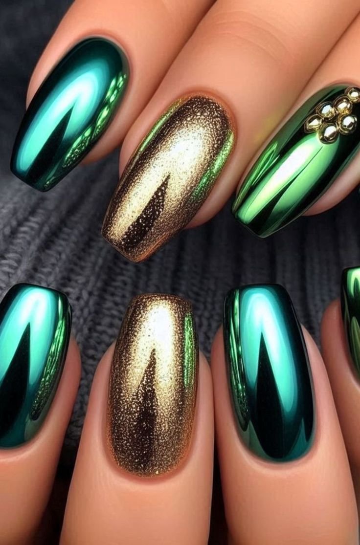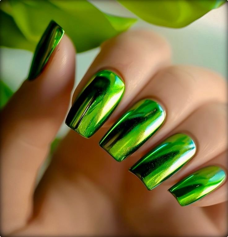 Metallic green nails are a bold and glamorous option for winter 2025–2026, offering a high-shine finish that instantly catches the light. This reflective style adds a futuristic edge to your manicure while still maintaining a festive feel.