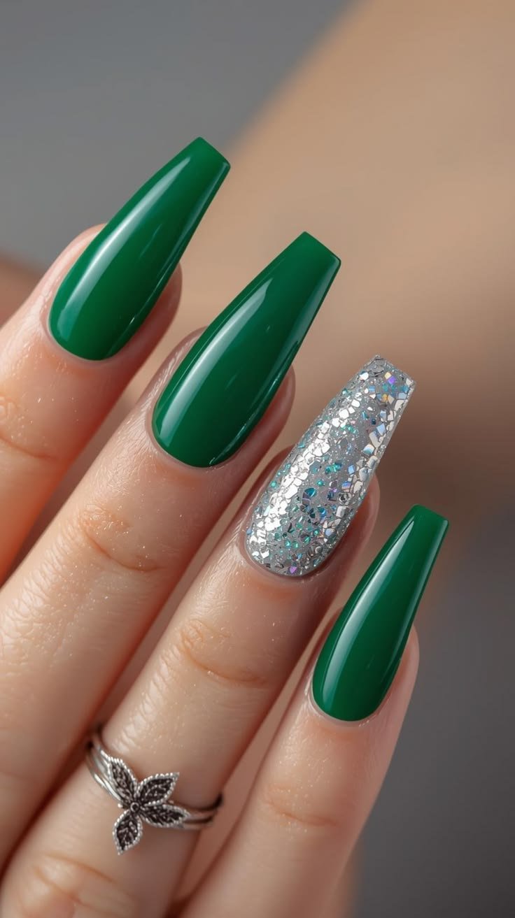 Green nails with glitter accents strike the perfect balance between simplicity and festive sparkle. Instead of covering all nails in glitter, this design focuses on one or two accent nails, allowing the shimmer to stand out without overwhelming the look.