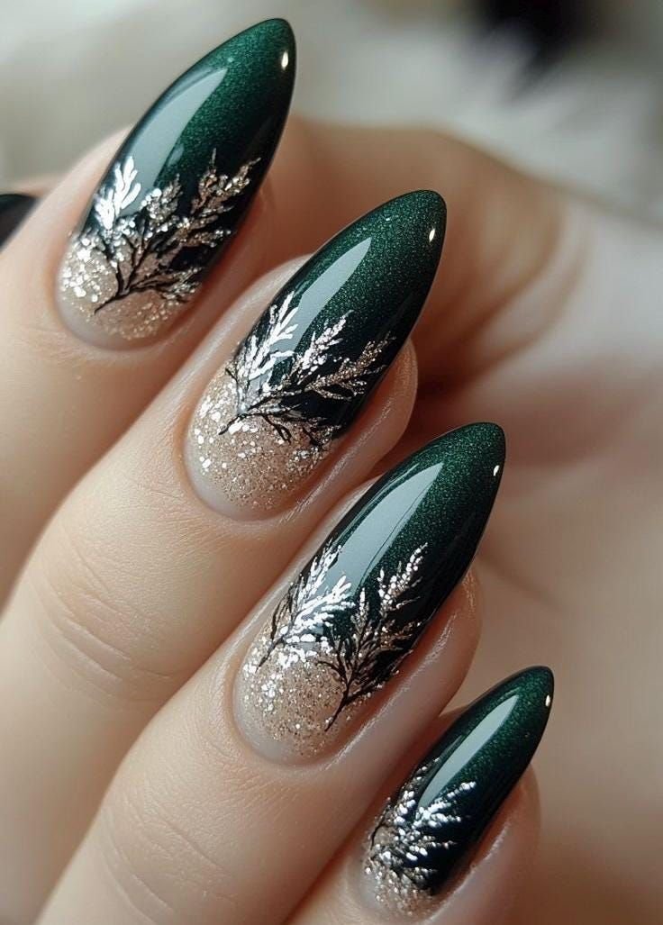 You can go all out with full glitter coverage or keep it balanced by adding sparkle to just one or two accent nails. Pairing forest green with silver or gold glitter enhances the festive vibe even more. These nails look stunning under holiday lights and complement cozy winter outfits beautifully.