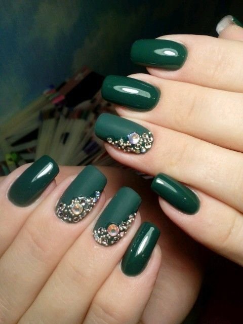 Rhinestone green nails are the ultimate choice for adding glamour and sparkle to your winter manicure. This design combines rich green shades with dazzling rhinestones or gems, creating a luxurious and eye-catching effect.