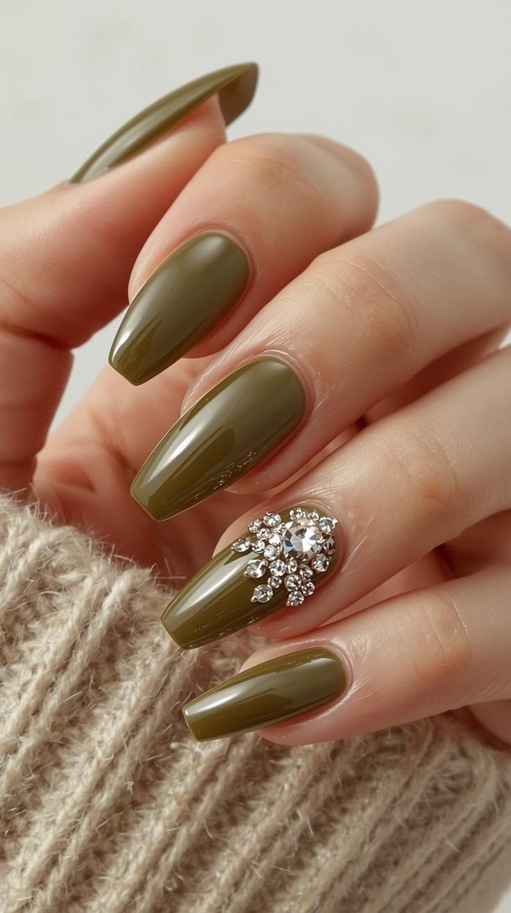 You can go for a bold look with multiple embellished nails or keep it elegant with a single accent nail featuring delicate stones. Pairing rhinestones with glossy or metallic green finishes enhances their shine and makes the design stand out even more.
