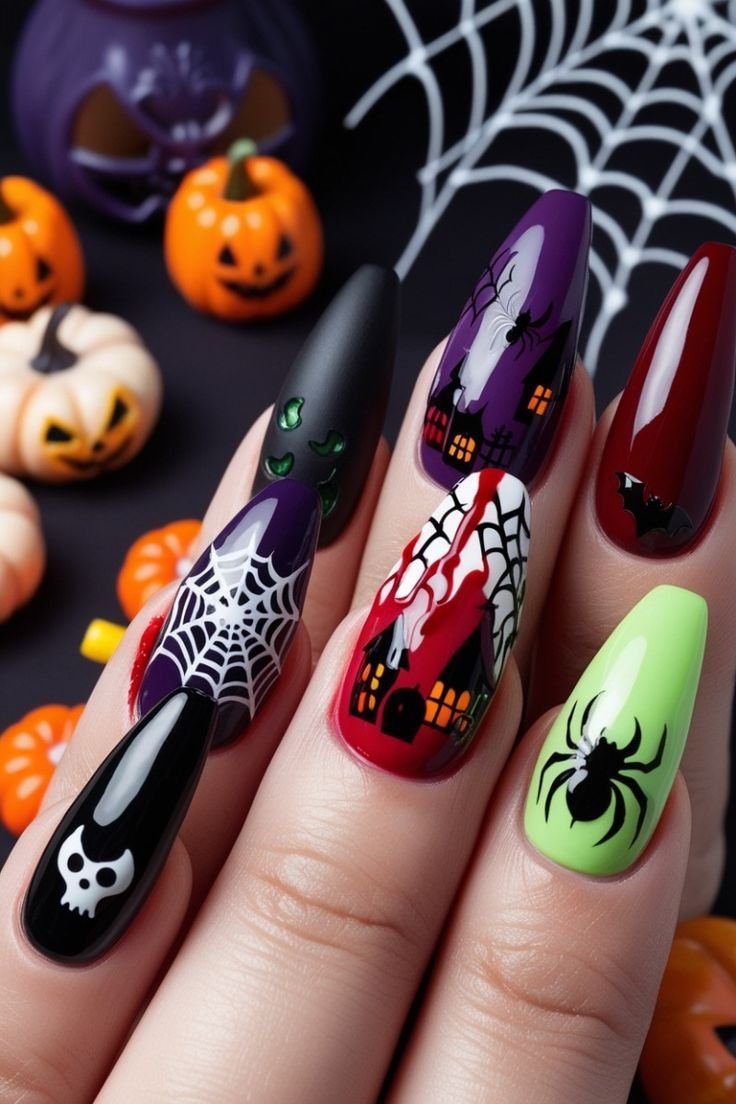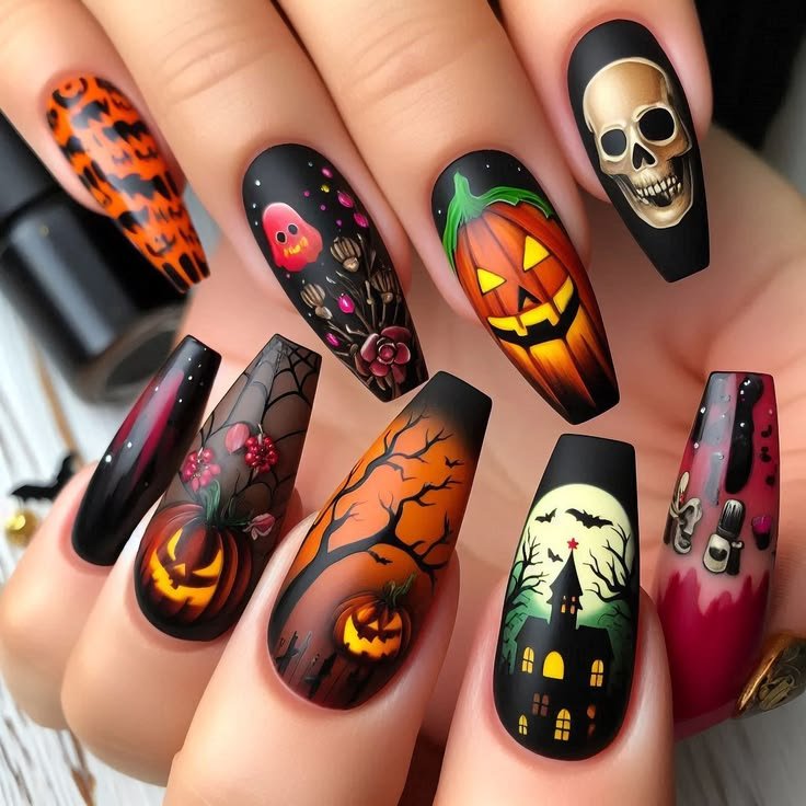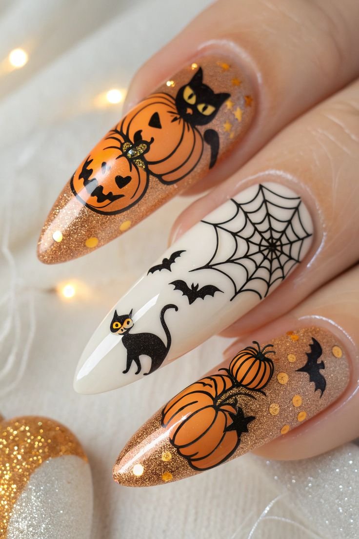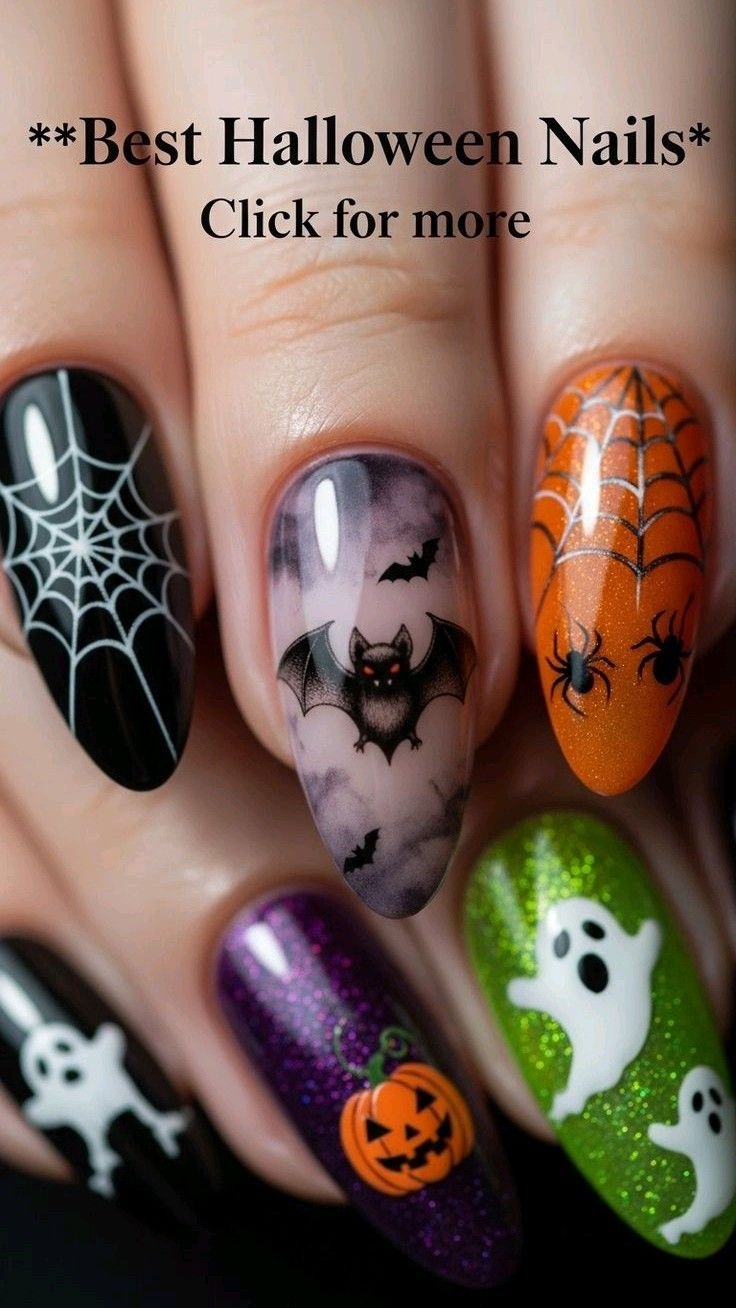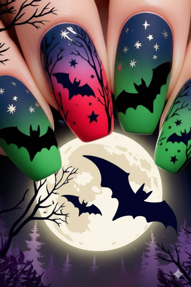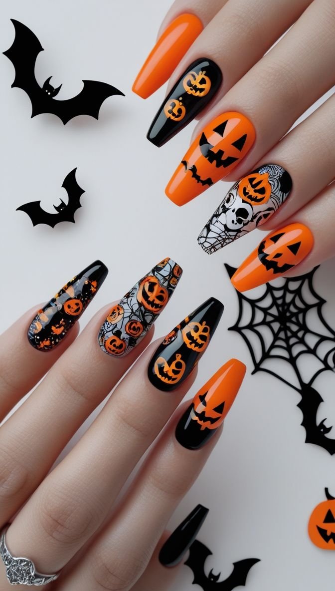 These designs can be subtle with just a single bat accent nail, or more daring with multiple nails showcasing different bat patterns, moon silhouettes, or starry night skies. Matte or glossy finishes can further enhance the visual impact, while tiny glitter accents add a hint of glamour. Bat-inspired nails also pair beautifully with other Halloween themes like spider webs, ghost accents, or pumpkin shades for a fully festive look.