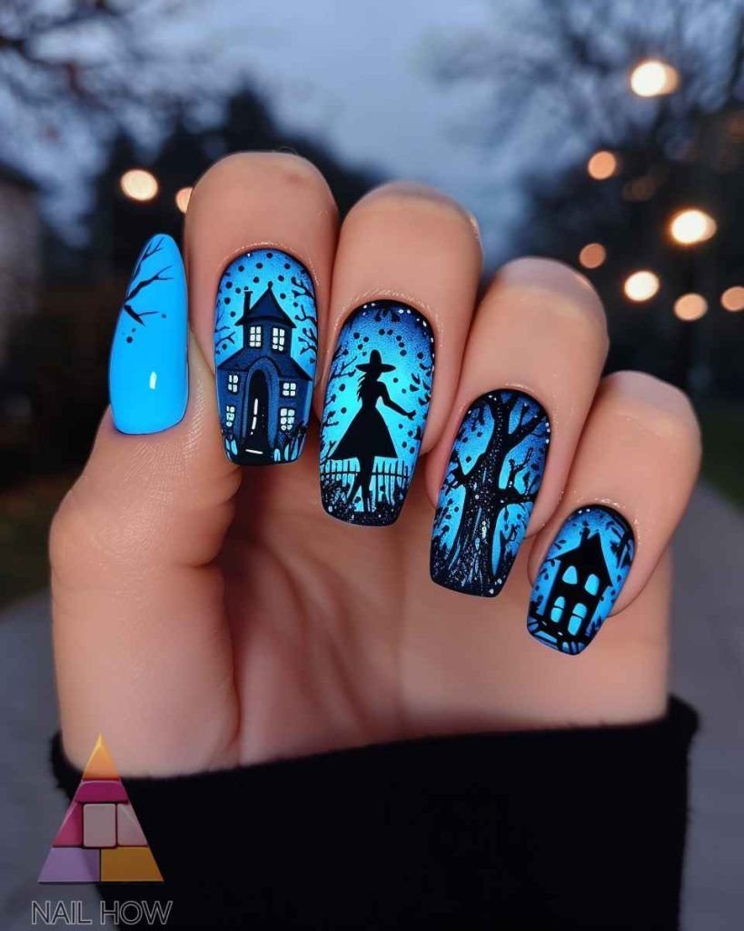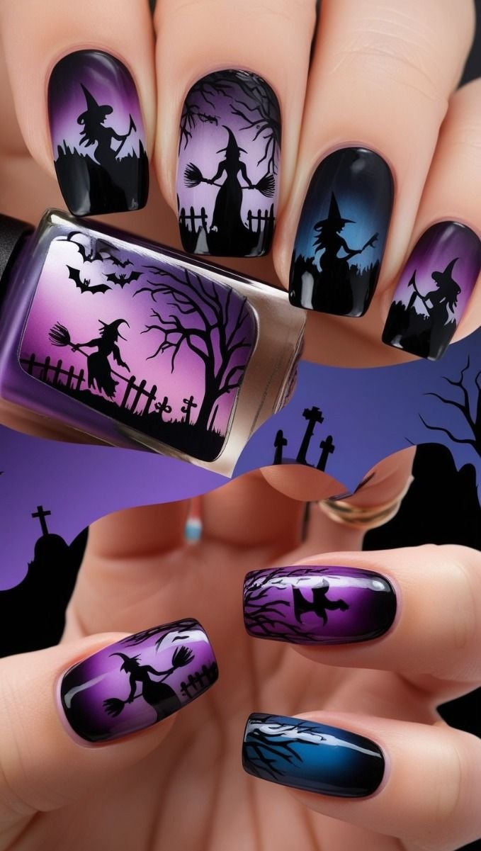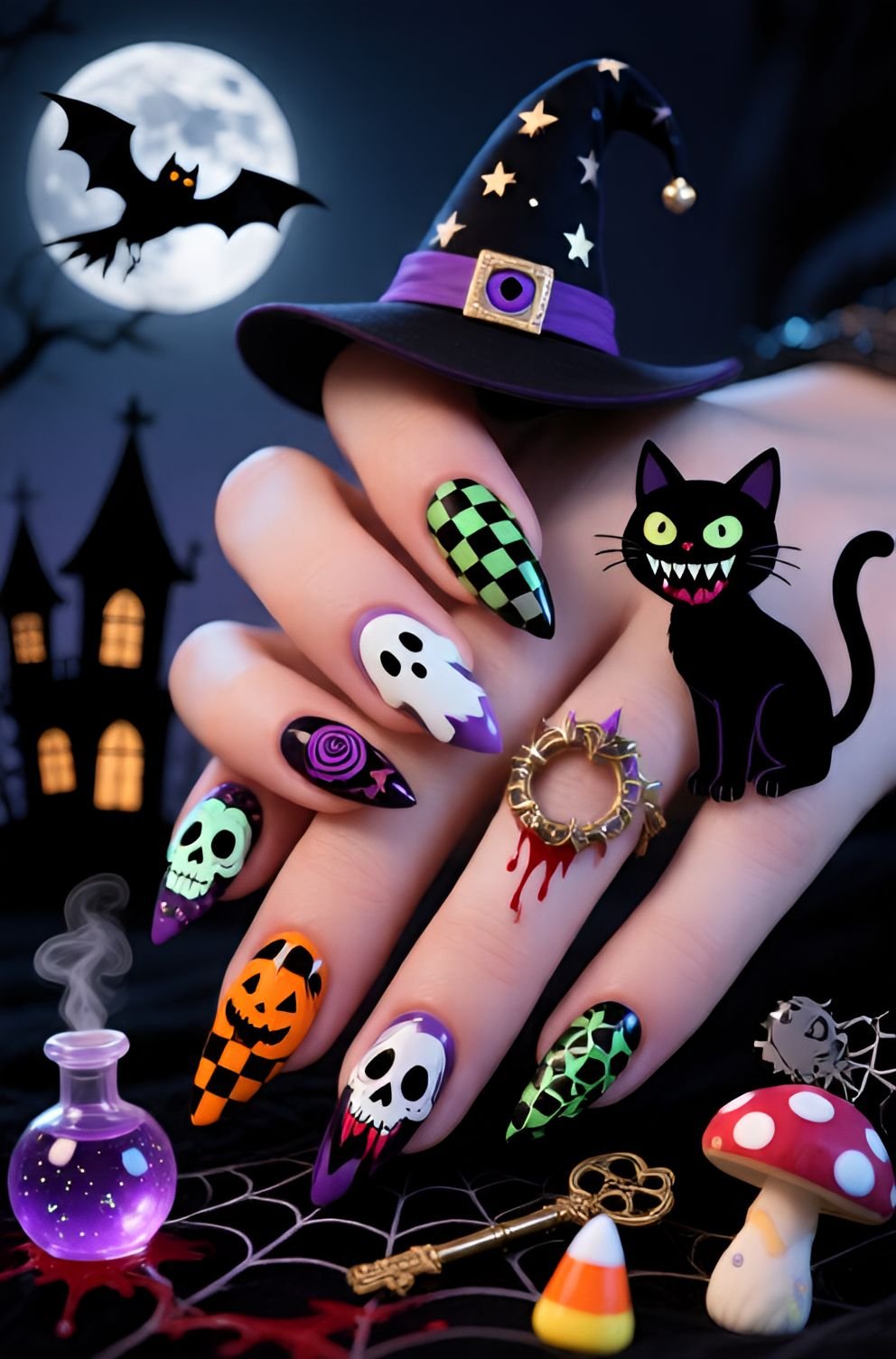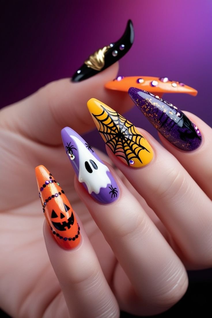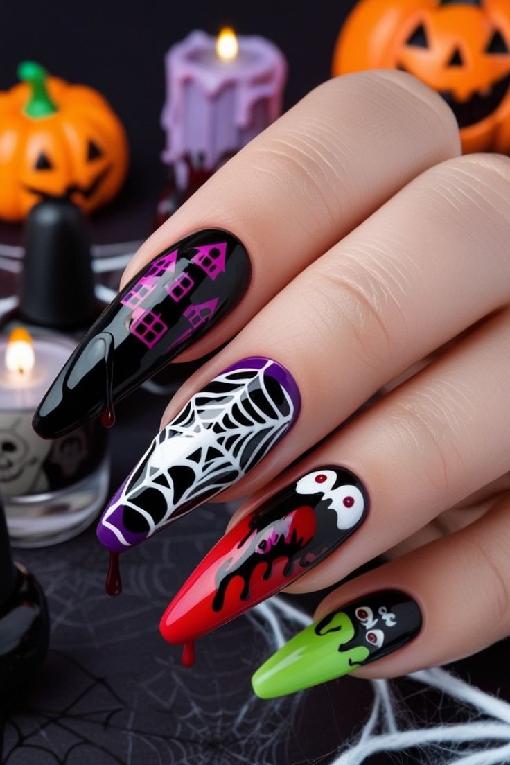 These designs can be subtle with just a single bat accent nail, or more daring with multiple nails showcasing different bat patterns, moon silhouettes, or starry night skies. Matte or glossy finishes can further enhance the visual impact, while tiny glitter accents add a hint of glamour. Bat-inspired nails also pair beautifully with other Halloween themes like spider webs, ghost accents, or pumpkin shades for a fully festive look.