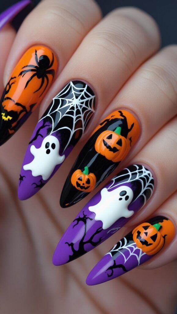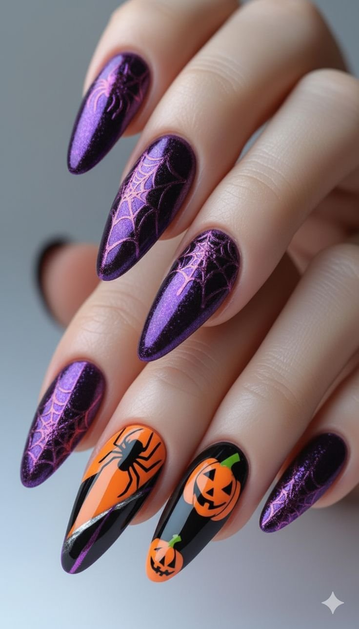 These designs work beautifully on any nail length and shape, from short rounded nails to long almond tips. For extra flair, you can add tiny spiders, glitter accents, or metallic lines to make the webs shimmer in the light. Combining matte black, deep purple, or dark orange with the web pattern enhances the fall vibe and gives your nails a mysterious, seasonal charm.