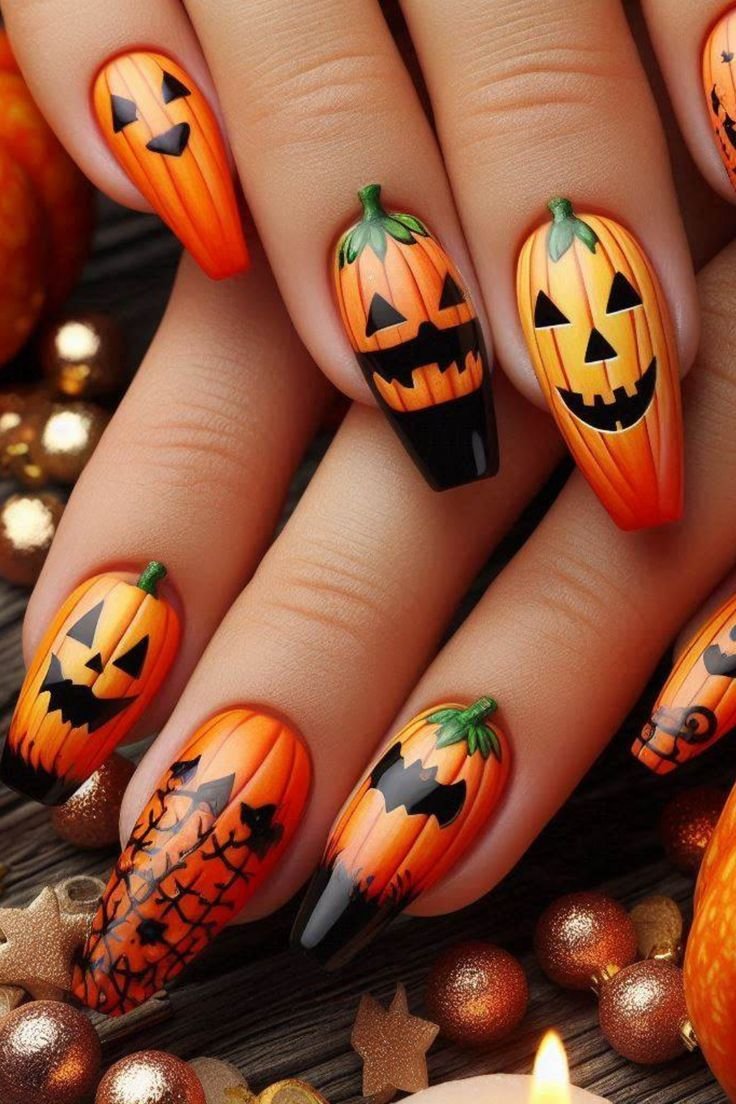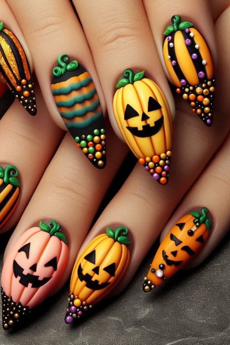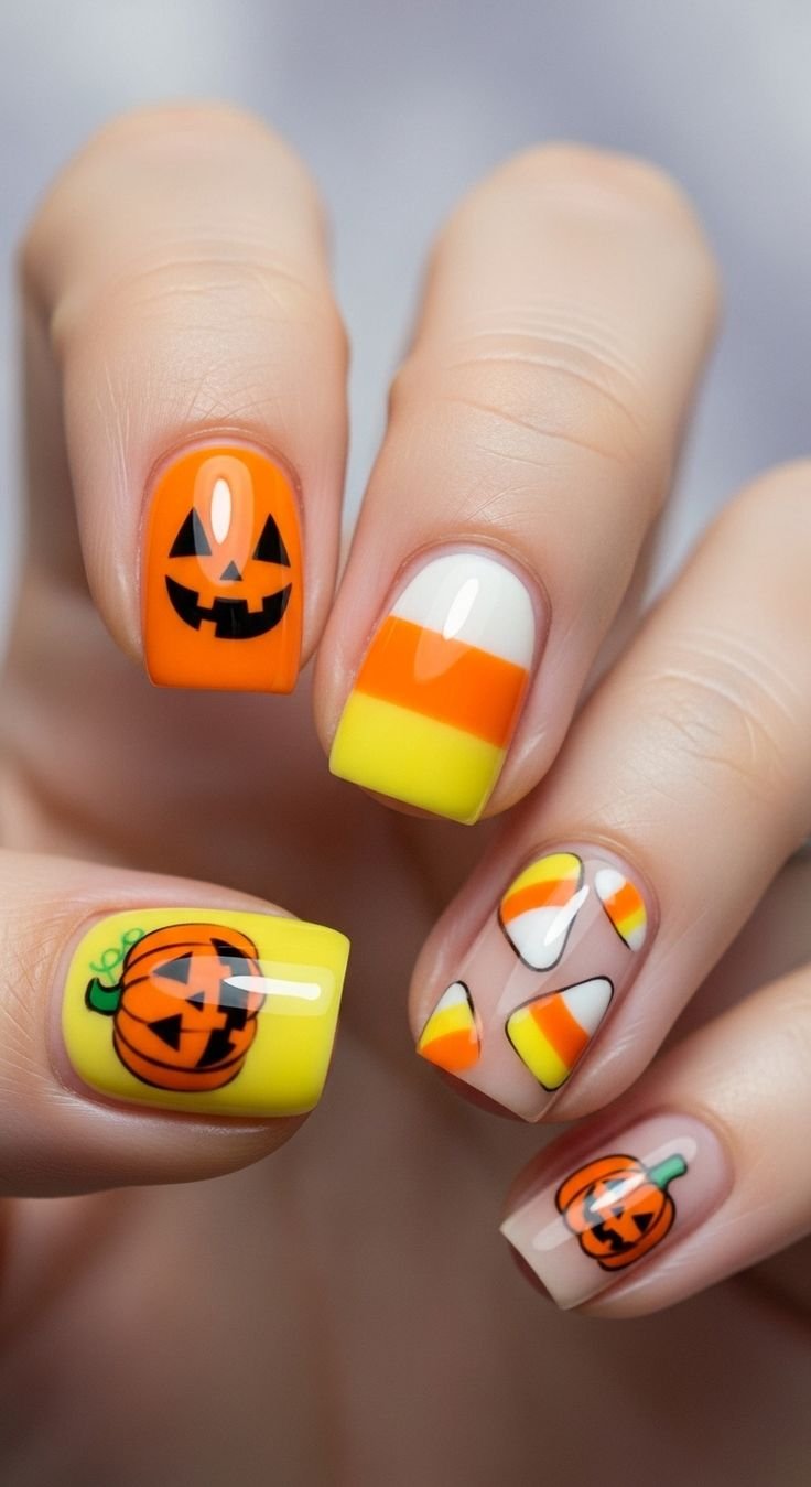 You can experiment with full-color block nails, ombré blends, or accent nails featuring candy corn patterns. Adding subtle glitter, tiny pumpkin decals, or Halloween motifs can enhance the look without making it too overwhelming. This style works on all nail lengths and shapes, from short and cute nails to long statement tips, allowing for creative expression tailored to your personal style.
