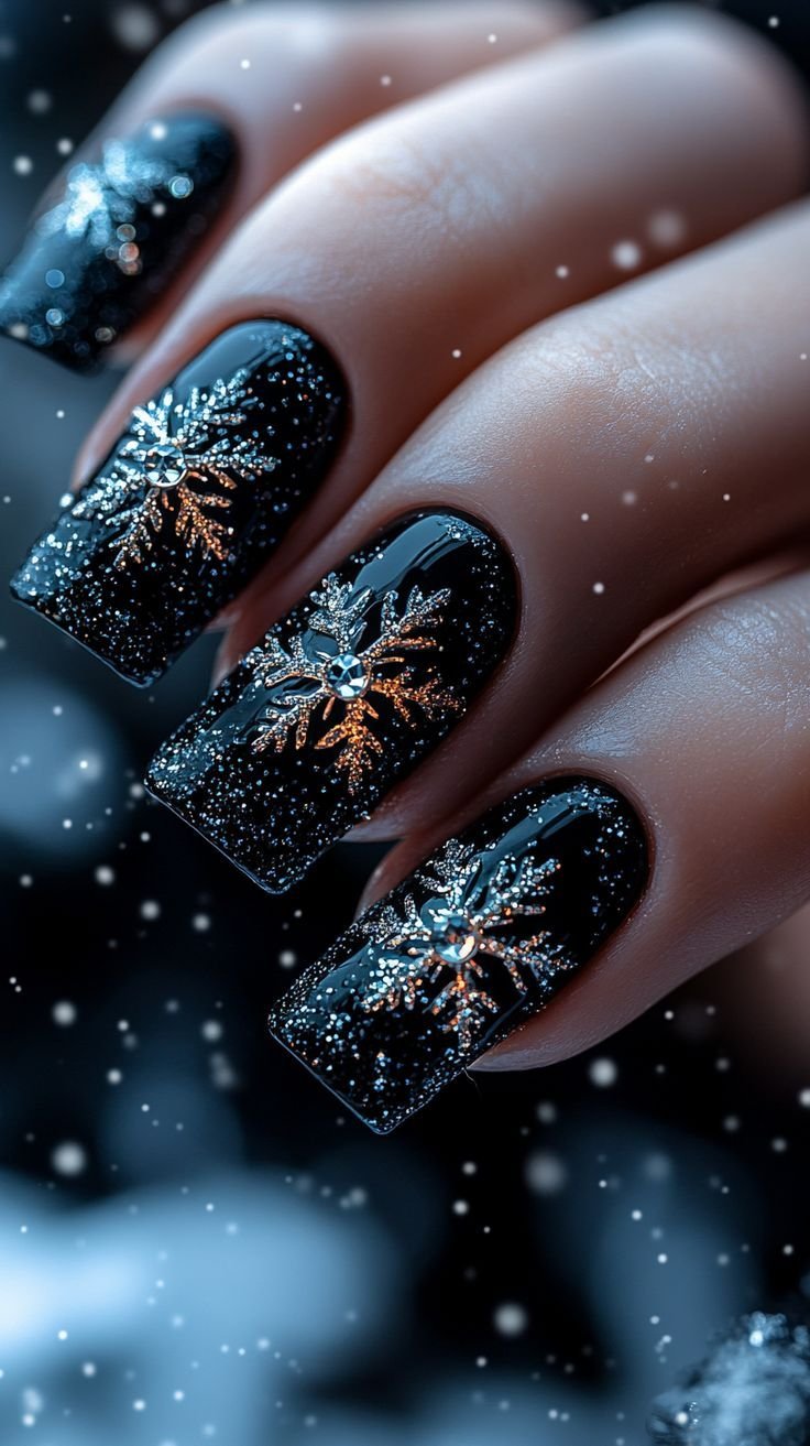 Black snowflake nails create a dramatic and stylish winter manicure. The dark base color provides a strong contrast that makes white or silver snowflake designs stand out beautifully. In 2025, glossy black polish combined with delicate snowflake patterns is becoming increasingly popular.
