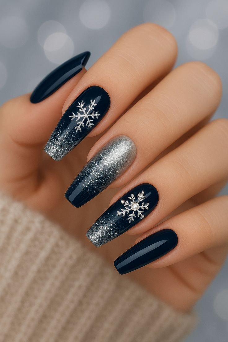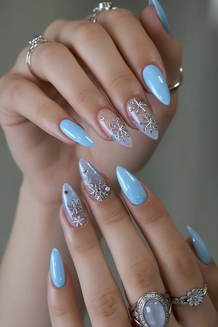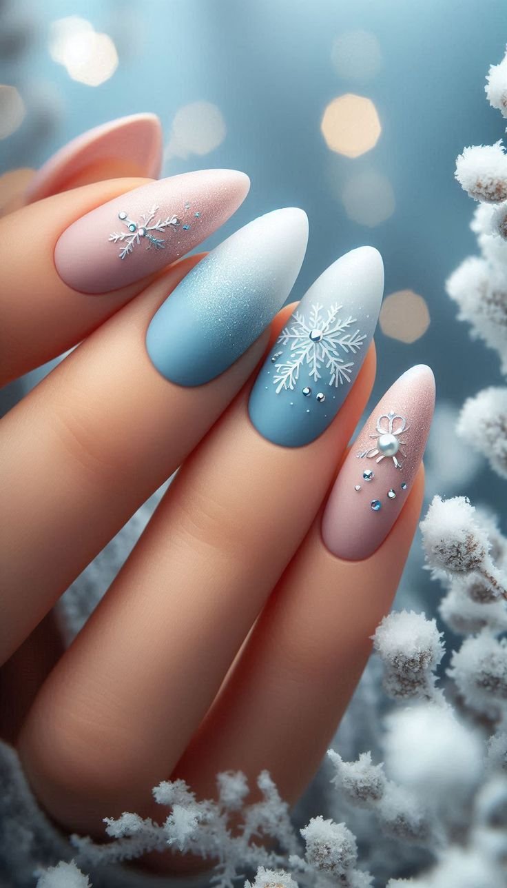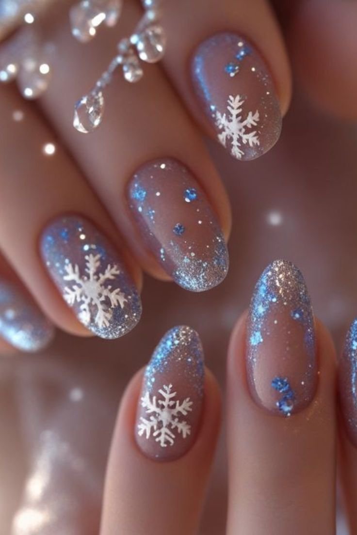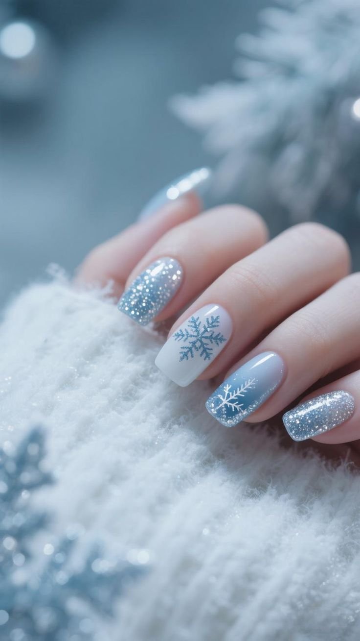 Popular colors include icy blue, silver glitter, and milky white. Some designs combine snowflakes with ombré effects or chrome accents.