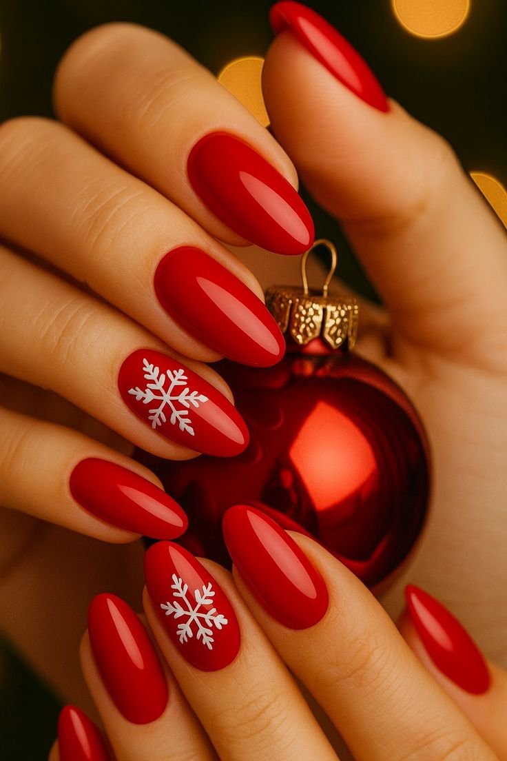 Snowflake patterns placed on accent nails create a balanced and elegant design. Gold foil or tiny rhinestones are sometimes added to give the manicure a festive sparkle. Red snowflake nails feel bold, joyful, and perfect for holiday celebrations. They pair beautifully with Christmas outfits and winter accessories.