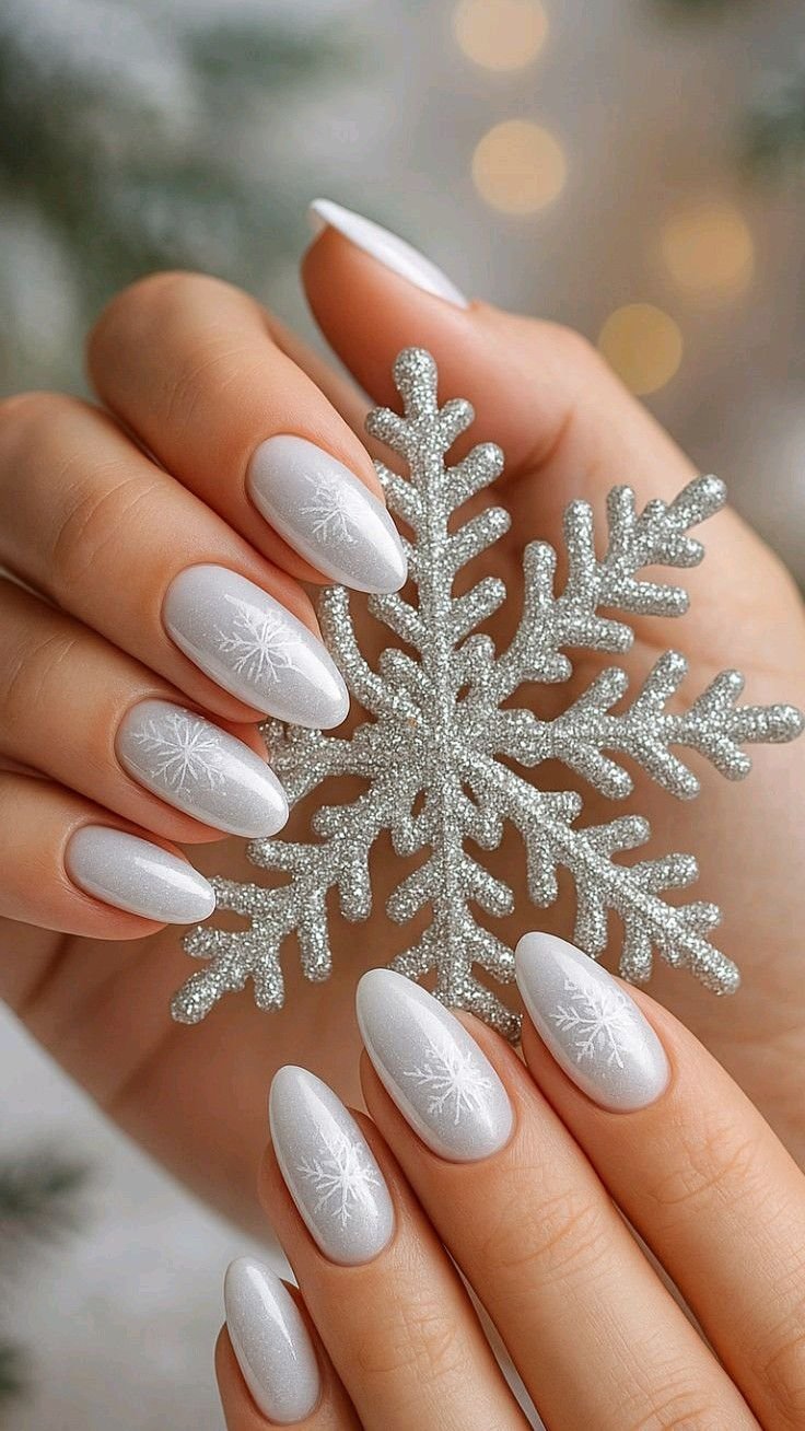 Almond-shaped snowflake nails are one of the most elegant winter manicure styles. The soft tapered shape makes fingers appear longer and more graceful. In 2025, almond nails decorated with delicate snowflake patterns are trending widely.