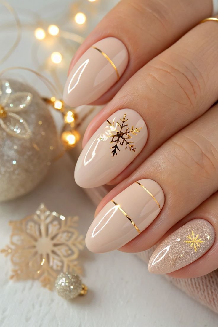 Gold snowflake nails add warmth and luxury to winter manicures. This design often features neutral or dark backgrounds such as black, navy, or deep burgundy. Gold snowflakes placed on top create a beautiful contrast that looks elegant and festive.