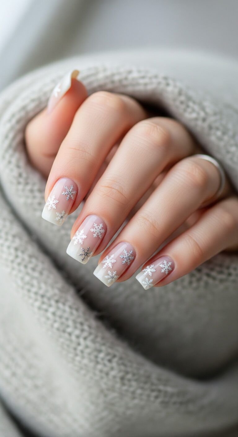 Ombre snowflake nails are a stylish choice for winter 2025. This design features a smooth gradient where one color fades into another. Popular winter combinations include white fading into icy blue or pale pink blending into silver glitter. Snowflake patterns are added on top to complete the winter theme.