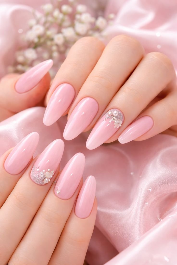 When elegance meets a touch of sparkle, the result is effortlessly stunning. Blush Pink Gel with Sparkling Silver Accent is a nail design that perfectly balances softness and shine. It’s feminine without being overly sweet, glamorous without being overpowering, and versatile enough for both everyday wear and special occasions.