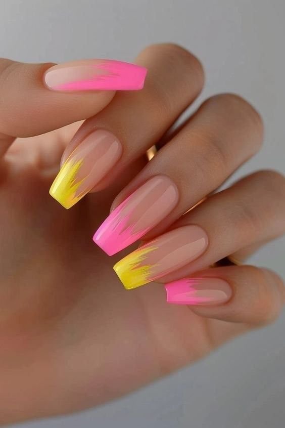 10.Bright Pink and Yellow French Tips with Playful Energy