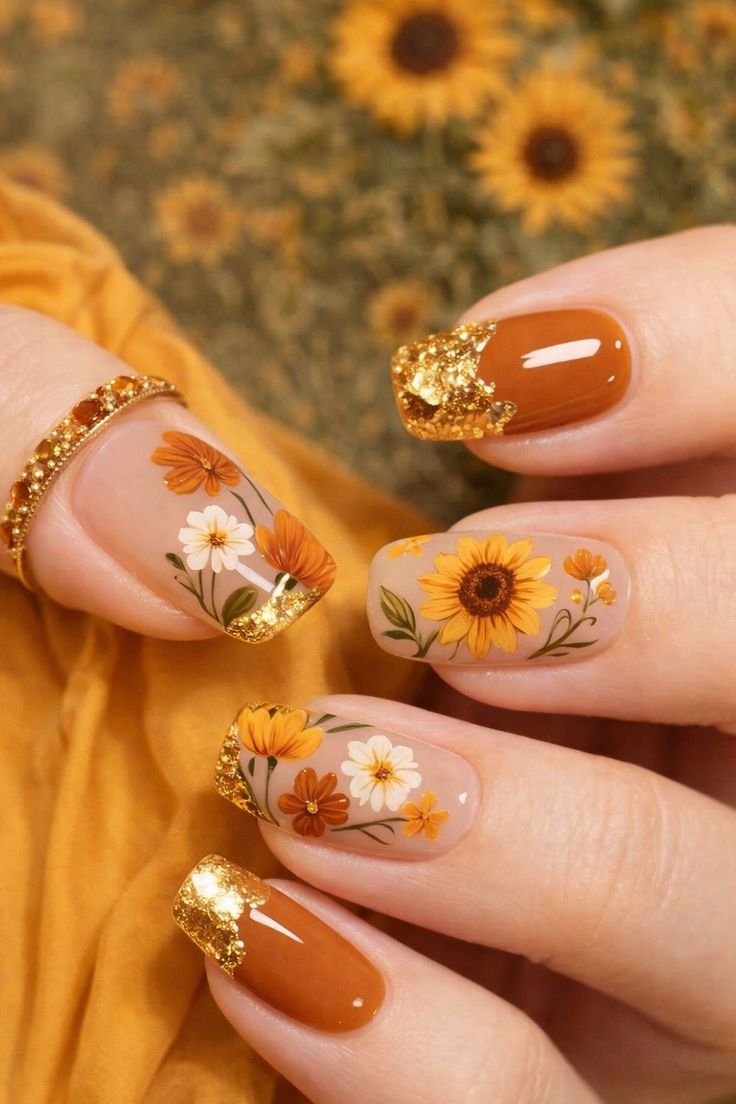 Glitter sunflower nails combine floral beauty with dazzling sparkle for 2026.
