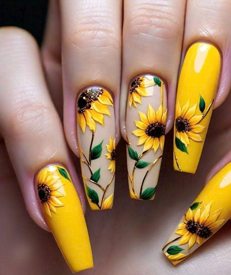 This creative twist blends elegance with playful detail. Some styles feature tiny sunflowers lining the tips, while others use yellow or gold tips with floral accents.
