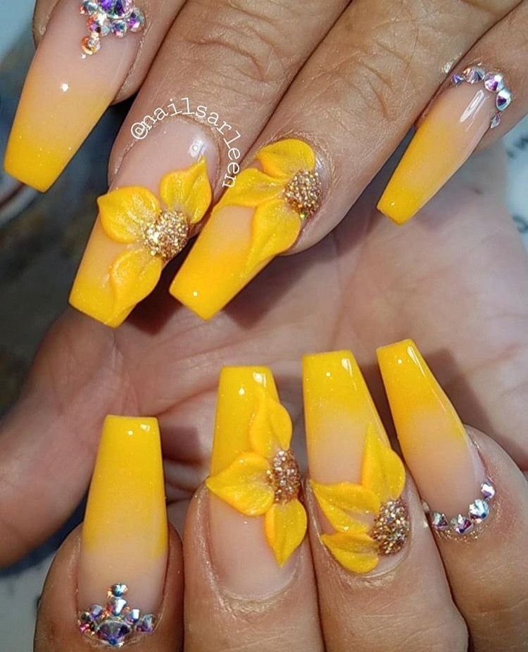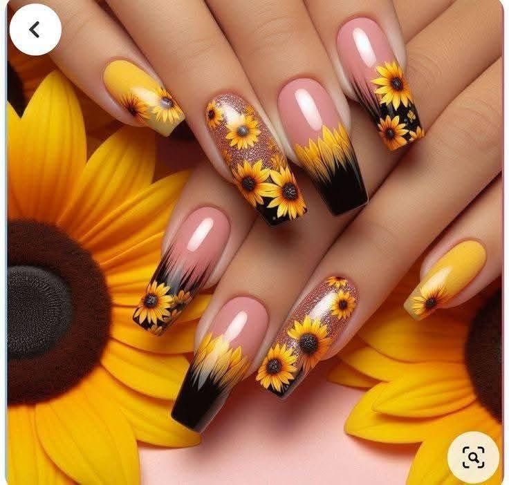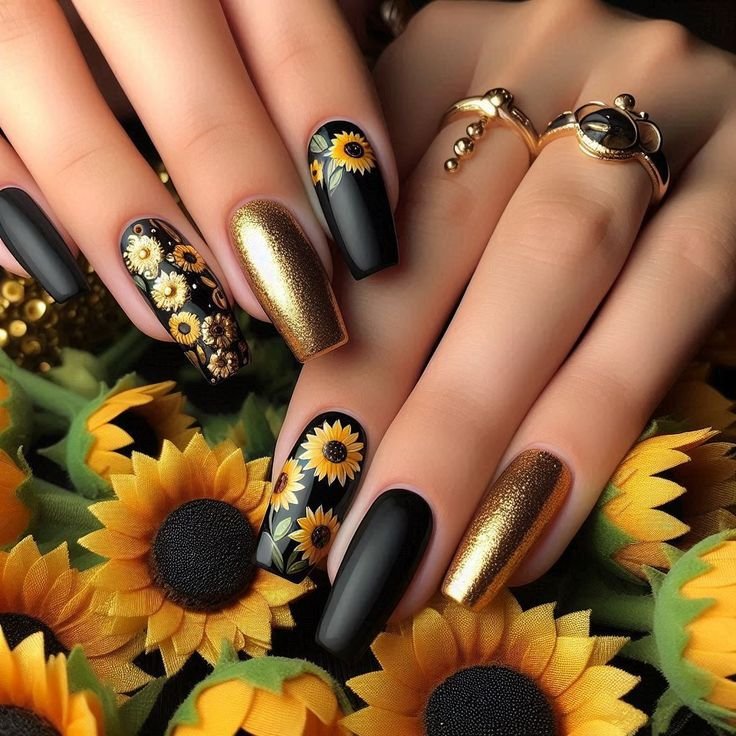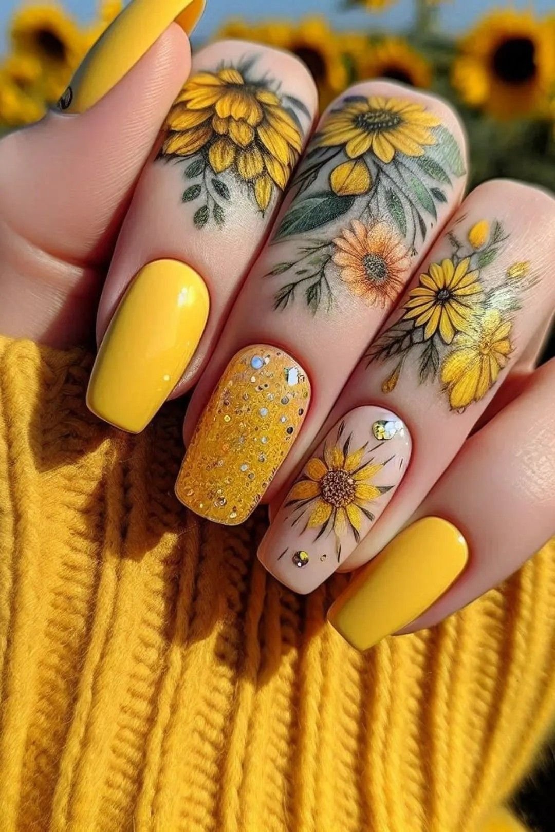 Glitter sunflower nails are a great choice for those who love bold, eye-catching manicures.