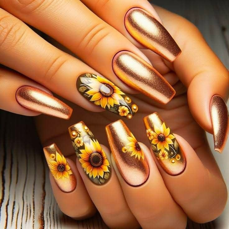Whether painted on a nude base or layered over bold colors, sunflower patterns instantly brighten your look. Nail artists are experimenting with detailed hand-painted flowers as well as minimalist versions using simple dots and lines.