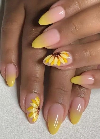 Ombre sunflower nails are trending in 2026 for their smooth color transitions. This style blends shades like yellow, orange, and nude to create a gradient effect, with sunflower designs layered on top. The ombre background adds depth and softness, making the flowers stand out beautifully. These nails are ideal for both casual and special occasions, offering a balanced mix of elegance and creativity. Ombre sunflower nails bring a modern touch to traditional floral art.