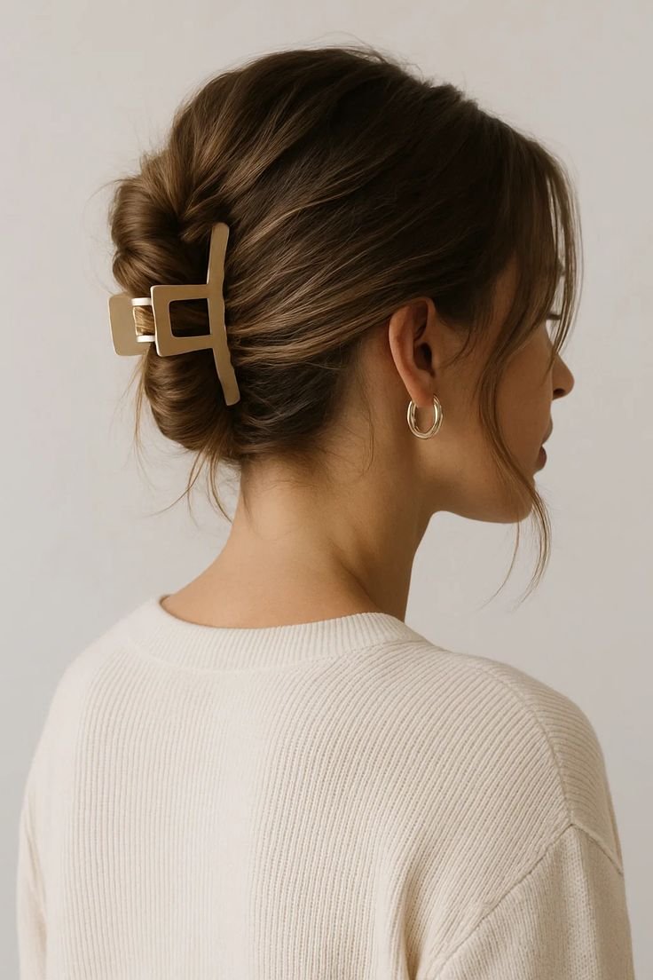 Twist hair upward from the nape and secure with a stylish claw clip. Let the ends cascade naturally. Pull a few strands around the face for softness. This quick updo feels trendy yet polished, making it perfect for busy days.