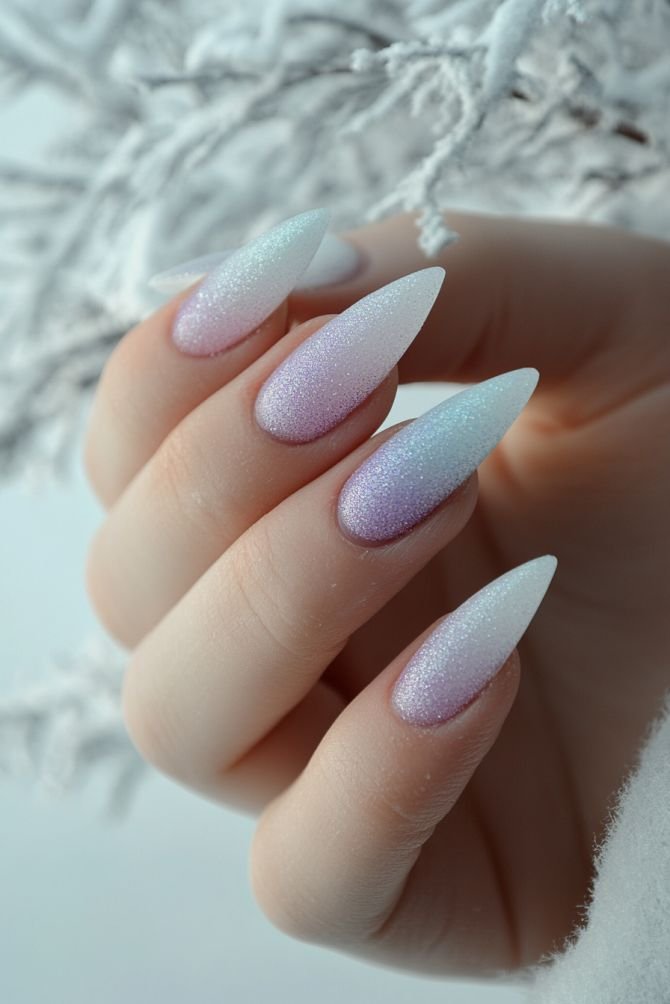 Ombré nails remain a favorite manicure style for winter almond nails. The gradual color transition creates a soft and elegant effect that suits the almond shape perfectly. Popular winter ombré combinations for 2025–2026 include white fading into icy blue, blush pink blending into glitter silver, and nude transitioning into deep burgundy.