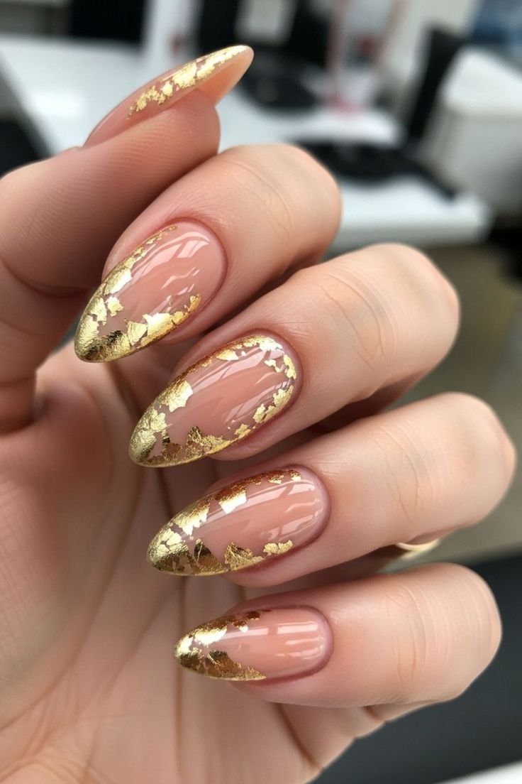 The almond shape enhances the elegance of the foil by giving the design a graceful silhouette. Many nail artists use clear or nude bases with scattered gold foil for a minimalist yet glamorous look. Others combine foil with marble effects or soft glitter backgrounds.