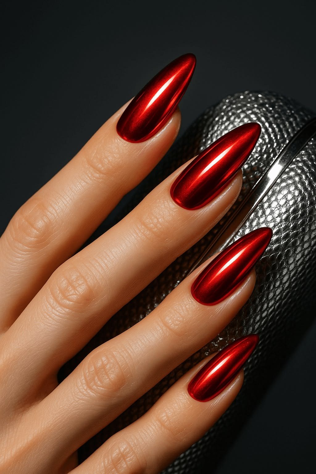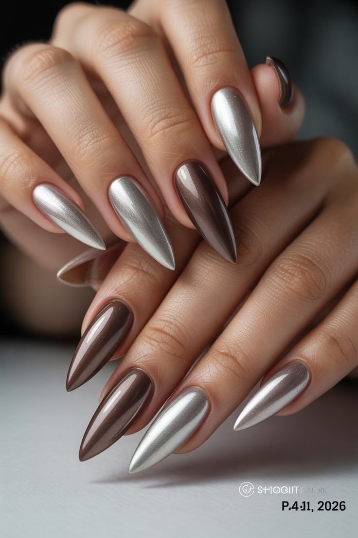 Silver chrome nails are a futuristic winter trend that continues to grow in popularity for 2025–2026. The mirror-like metallic finish creates a bold yet elegant statement on almond-shaped nails. Chrome polish reflects light beautifully, giving the nails a sleek and polished appearance.
