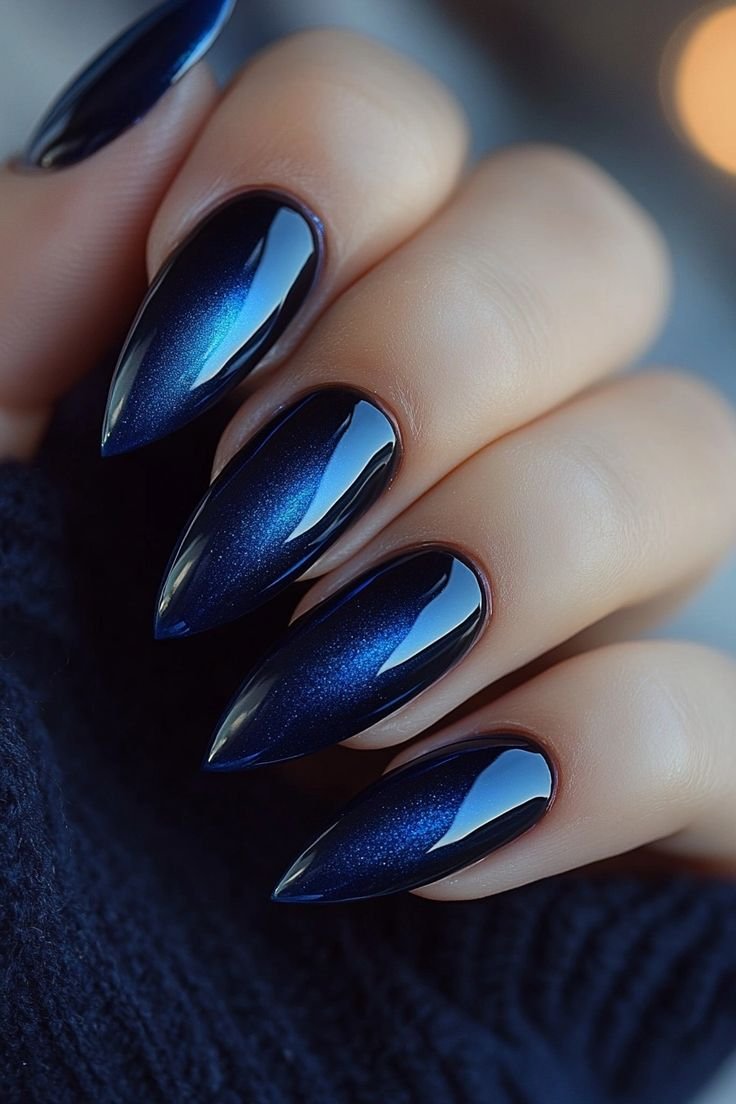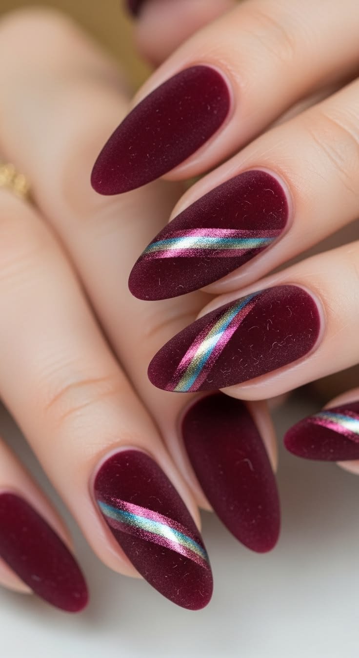 Velvet nails are one of the most luxurious winter trends for the 2025–2026 season. This design uses magnetic polish to create a soft, shimmering texture that resembles velvet fabric. When applied to almond-shaped nails, the effect looks elegant and dimensional.