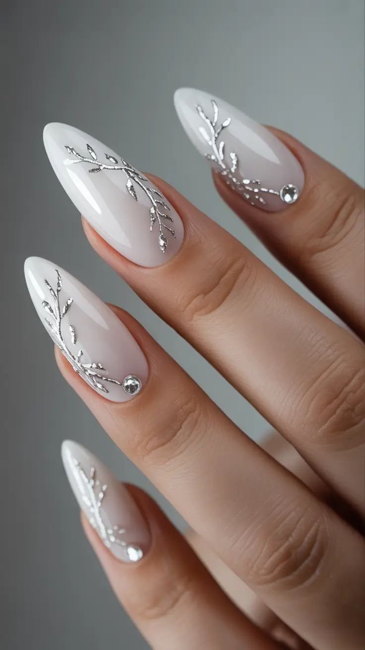 Pearl accents are adding a touch of luxury to winter almond nails in the 2025–2026 season. Tiny pearl embellishments placed along the cuticle or arranged in delicate patterns create a sophisticated manicure. These designs usually start with soft neutral bases such as milky white, blush pink, or pale beige.