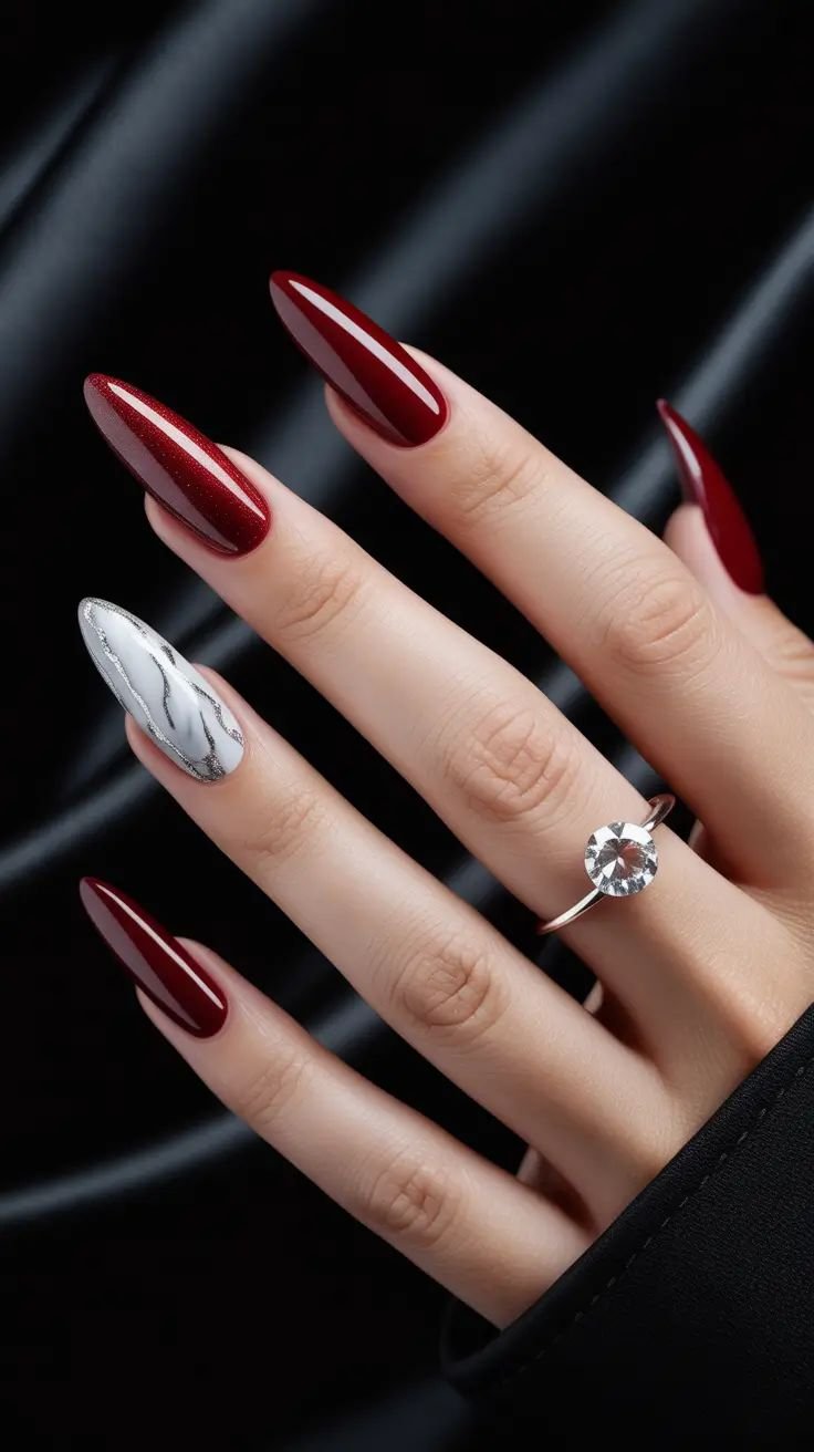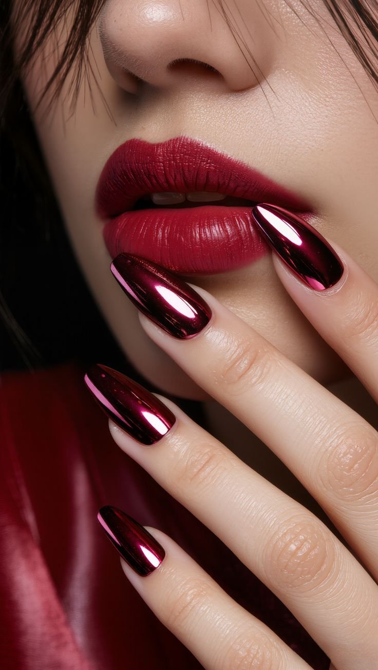 Deep burgundy is one of the most sophisticated winter nail colors for 2025–2026. On almond-shaped nails, this rich shade looks incredibly elegant and timeless. Burgundy nails pair beautifully with winter clothing like wool coats, leather gloves, and cozy knitwear.