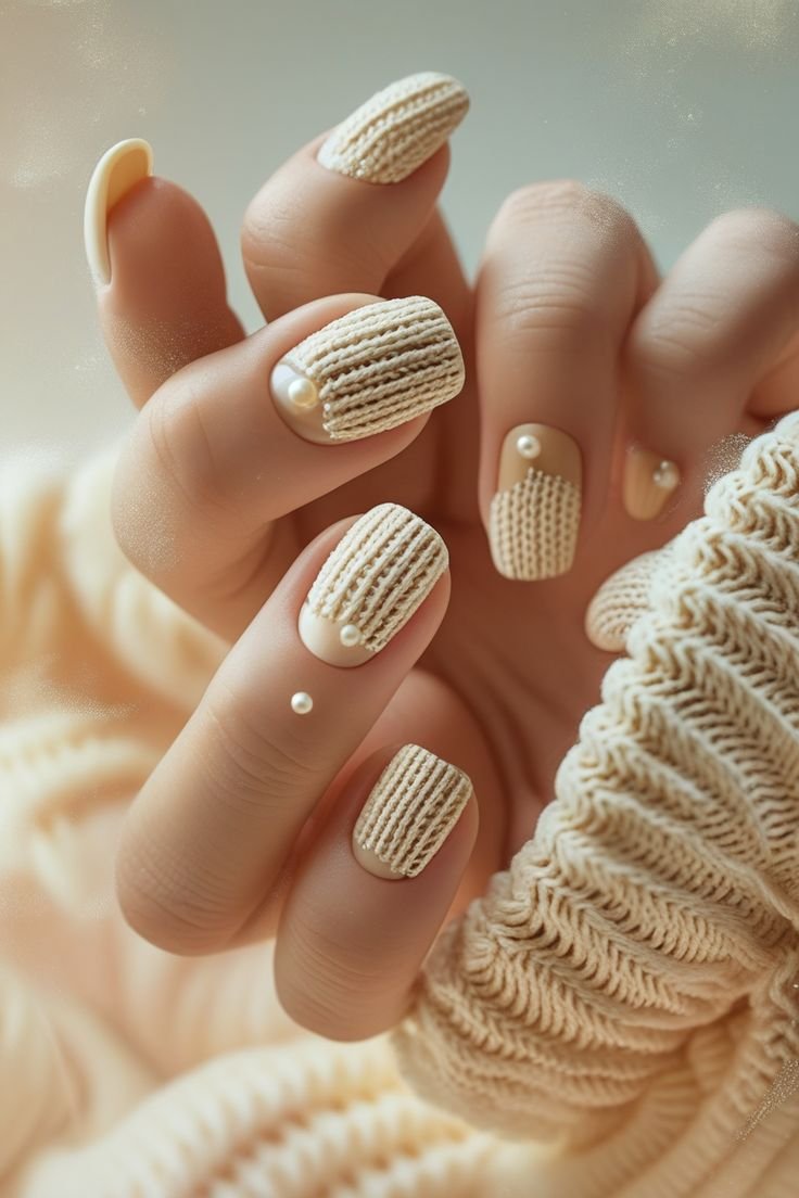 Sweater-inspired nail designs are one of the coziest winter trends for almond nails in 2025–2026. These designs mimic the knitted texture of winter sweaters using raised gel patterns. Popular colors include cream, soft beige, dusty rose, and warm taupe.
