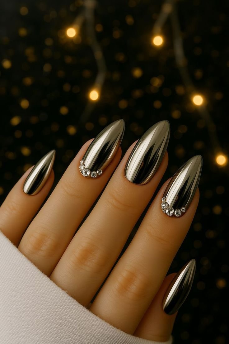 Many designs pair silver chrome with minimalist accents such as thin black lines or tiny crystals. Others combine chrome with soft nude bases to create a modern French tip effect. The almond shape helps balance the bold metallic shine by keeping the overall look refined.