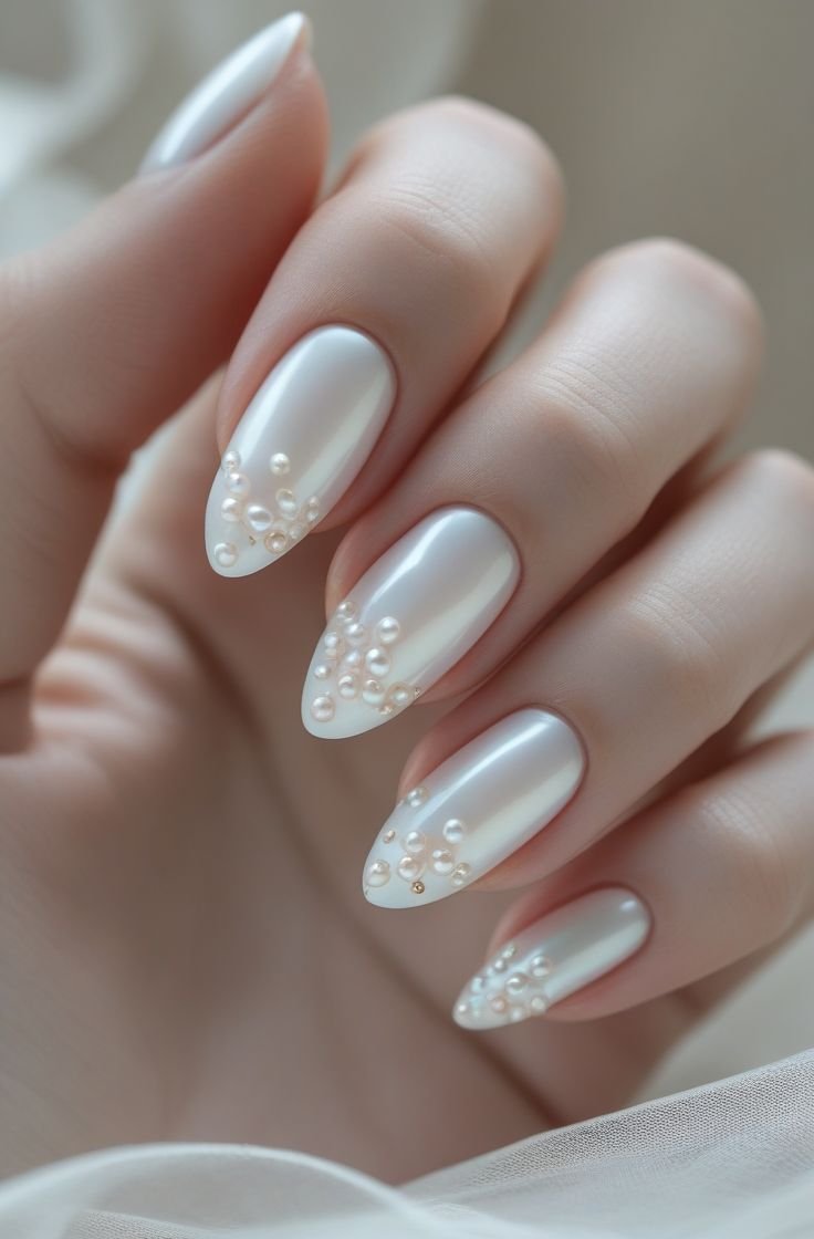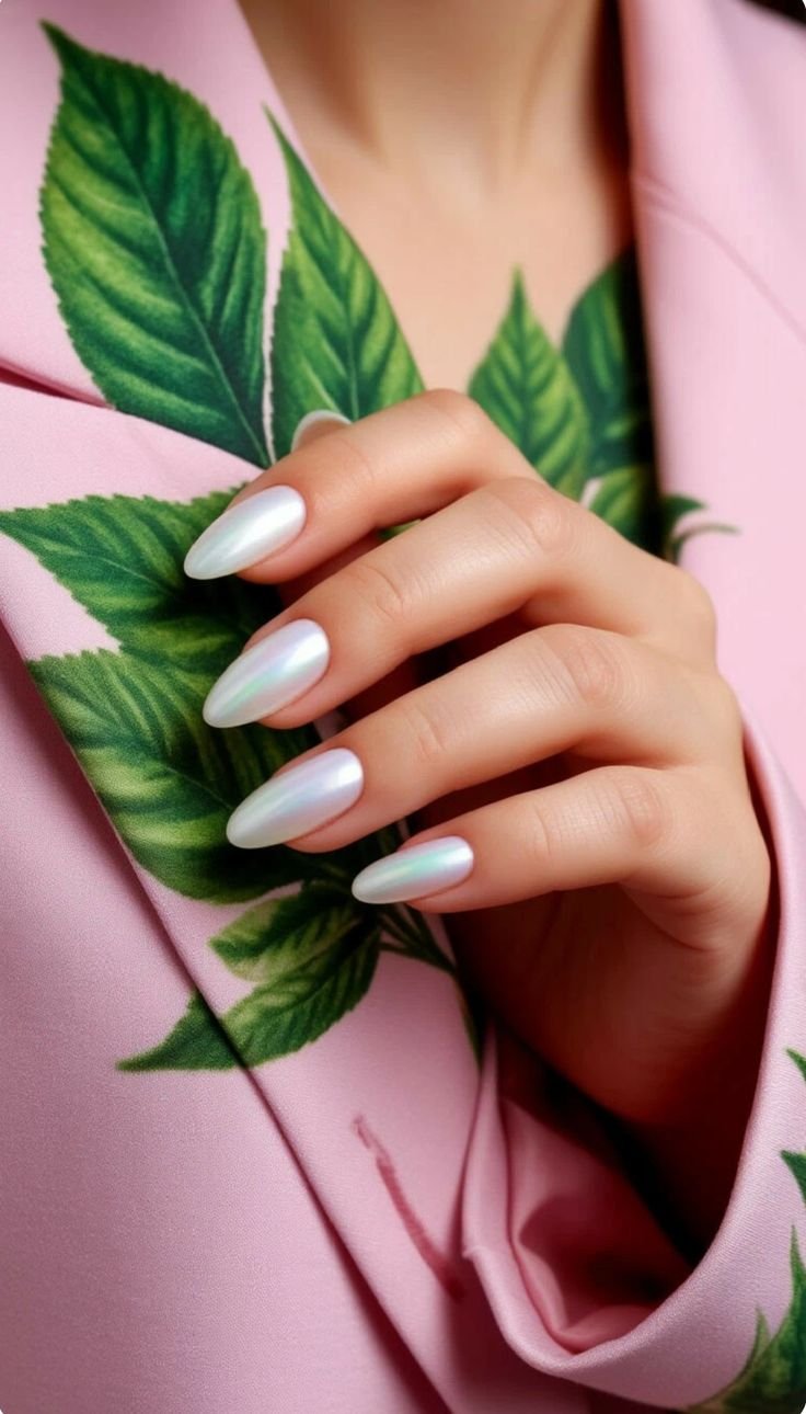 Pearl finishes are a major trend for winter 2026, offering a soft, luminous look for almond nails. This style focuses on subtle shine rather than bold sparkle, creating a refined and elegant manicure.